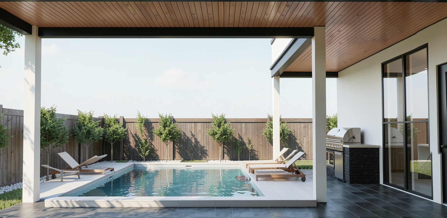 update this image by adding a very small integrated rectangular cocktail style pool maintain the exact architecture layout geometry landscaping materials grading and all existing elements exactly as shown do not modify or move the house porch or planting layout the pool should be compact and understated in scale clearly a small cocktail pool integrated directly with the existing patio deck not floating in the yard positioned so it feels like a natural extension of the outdoor living space include a tanning deck sun shelf within the pool at one end sized proportionally to the small pool add built in in water tanning loungers on the sun shelf only similar to the reference image appearing minimal and clean in design light neutral in color partially submerged in shallow water do not add any furniture outside of the pool itself use light natural materials light neutral interior pool finish with subtle variation clean minimal coping that aligns with the existing deck material flush transitions between pool edge and surrounding surfaces the pool should feel intentional but secondary not the focal point it should read as an optional upgrade that fits comfortably within the yard water should appear clear calm and highly realistic with soft reflections and natural light movement do not add additional hardscape landscaping or accessories do not enlarge the yard or change grading the final image should appear clean photorealistic and editorial as if professionally photographed for a luxury real estate listing avoid distortion the pool should feel properly scaled restrained and seamlessly integrated with the rest of the image remaining unchanged the pool should flow seamless with the porch the tanning deck should be on the left side towards the fence no chairs should be on the right side towards the grill that area should remain clear