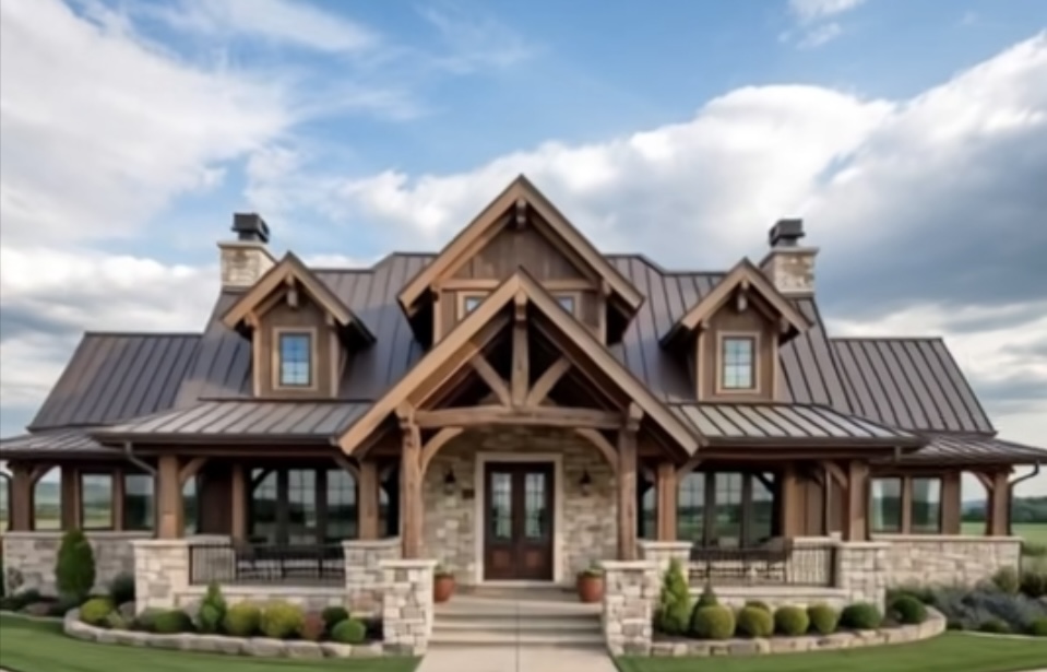 a modern farmhouse with white vertical siding dark charcoal roof and stone chimney the house is warmly illuminated from within with soft golden light surrounding the house are autumn trees with vibrant orange leaves in the foreground a mix of gray pavers and pebbles lead to the entrance bordered by tall grasses in muted greens and browns the sky is a dreamy mix of soft pink and orange hinting at a serene sunset casting a tranquil and warm atmosphere