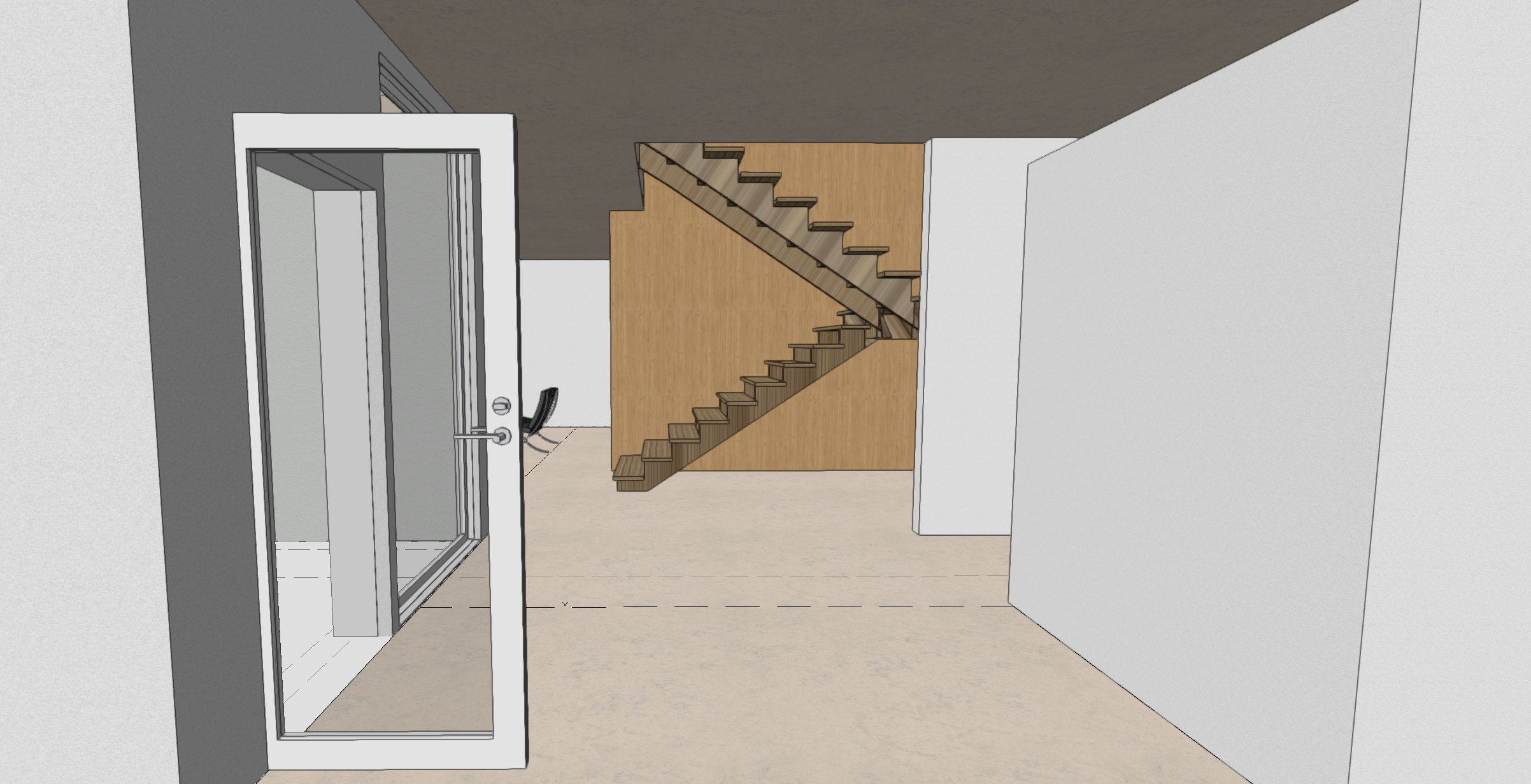 keep geometry view from a doorway looking inside mid century modern look add some big house plants in pots underneath the staircase and put a jackson pollock painting on the right wall floor is travertine stone the white walls and ceiling are white drywall direction of soft sunlight is going from left to right