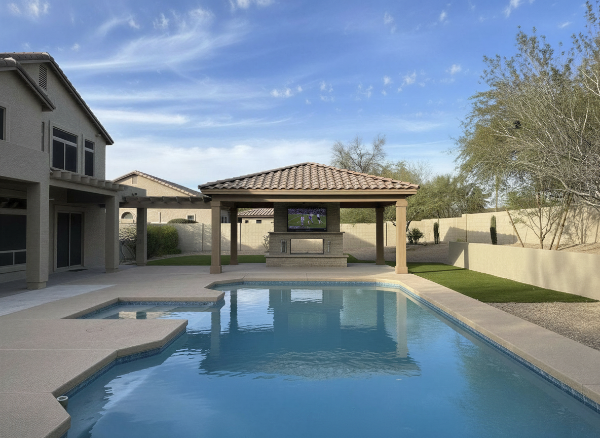 exterior shot a luxurious modern house with a sleek design featuring light cream walls and elegant wooden accents in a rich mahogany color the roof is a sophisticated grey architectural shingles contrasting beautifully with the lush green lawn and maple and pine trees gently swaying in the breeze in the driveway a stylish black sports car adds a touch of sophistication the atmosphere is serene and inviting with a sky painted in soft blues and gentle pink hues of a sunset enhancing the tranquil ambiance
