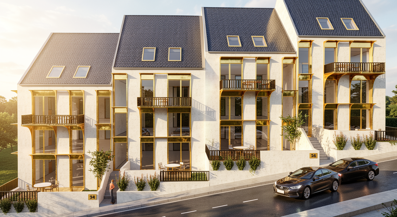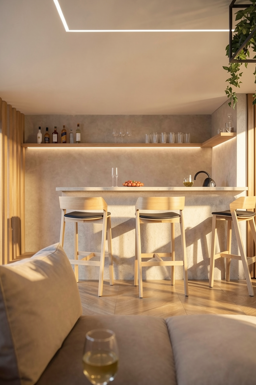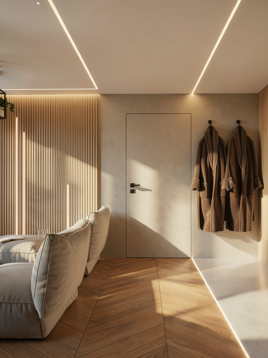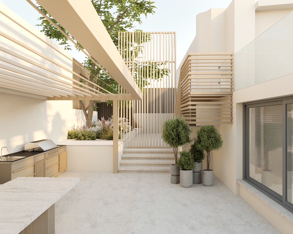 a calm elegant contemporary outdoor courtyard with a minimalist architectural language the scene features a decorative screen made of beige slats creating a refined semi transparent partition and adding rhythm depth and visual lightness to the composition the surrounding walls are smooth warm white plaster keeping the palette soft and understated lighting should be soft and natural like late afternoon daylight with gentle shadows and a calm luxurious mood the final render should look refined realistic and architectural with strong material clarity and a high end design feel grey aluminium glass light beige color at the walls the railing of the stair is also beige nice sky keep the geometry as it is in the planter on the right spike lights are integrated within the pebbles directing a soft focused light onto the plants enhancing their volume and texture