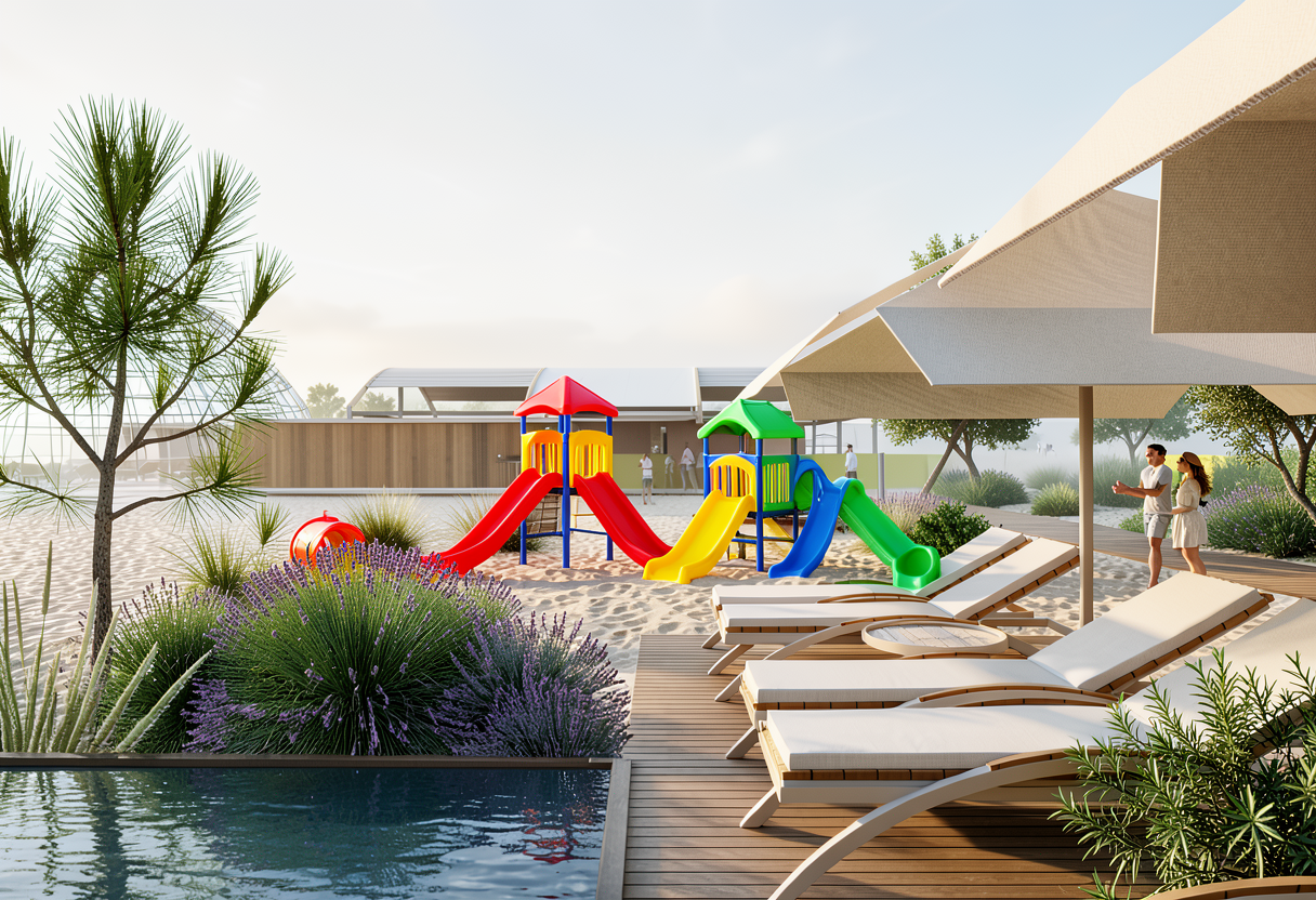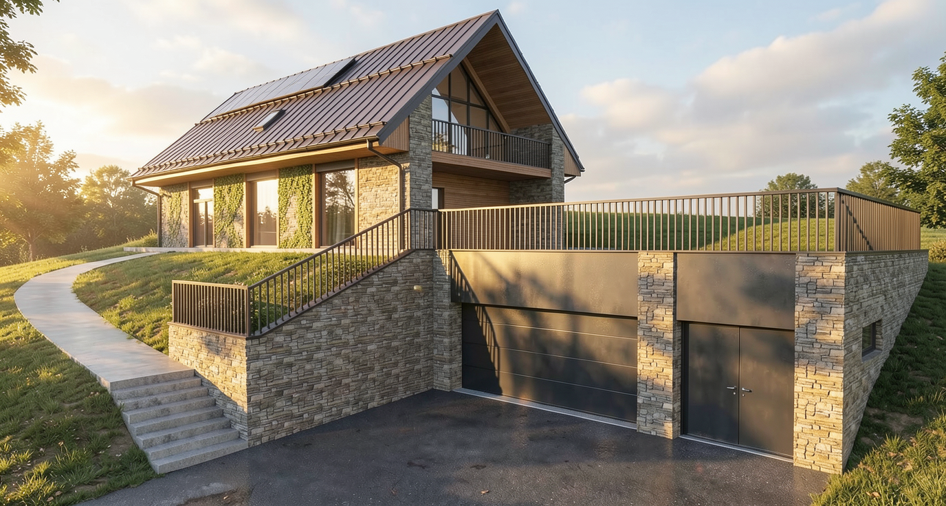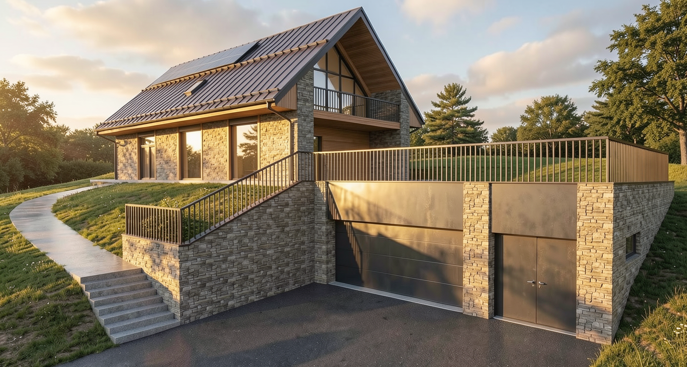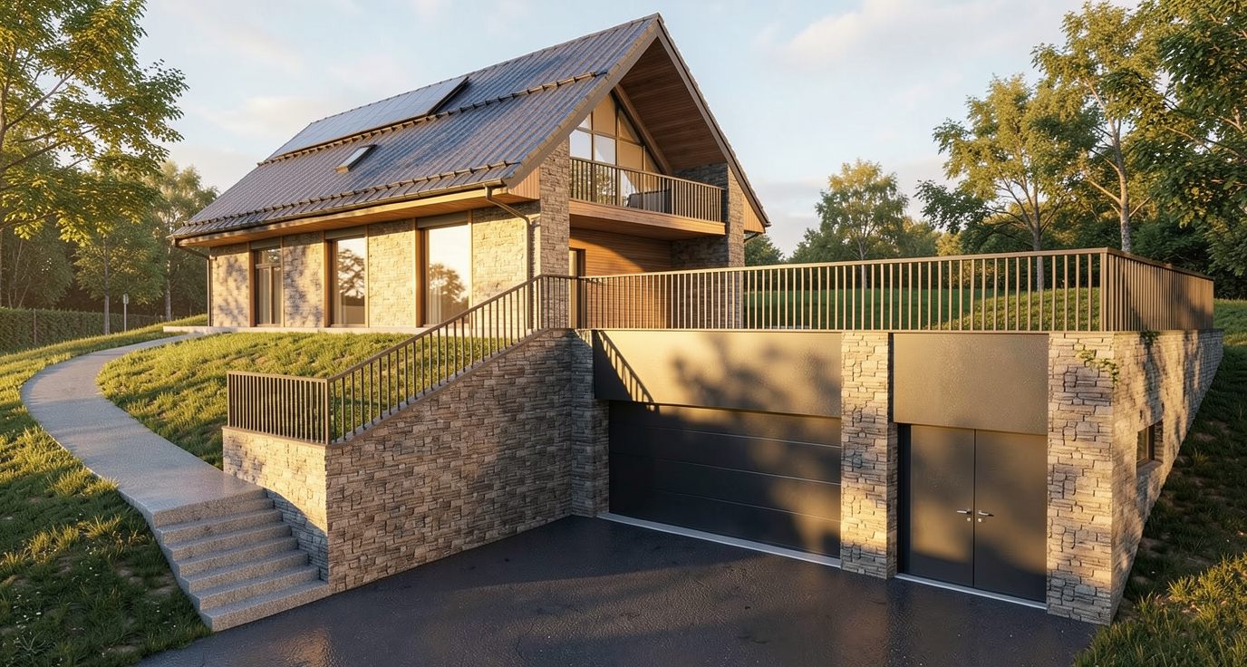a calm elegant contemporary outdoor courtyard with a minimalist architectural language the scene features a decorative screen made of beige slats creating a refined semi transparent partition and adding rhythm depth and visual lightness to the composition the surrounding walls are smooth warm white plaster keeping the palette soft and understated lighting should be soft and natural like late afternoon daylight with gentle shadows and a calm luxurious mood the final render should look refined realistic and architectural with strong material clarity and a high end design feel grey aluminium glass light beige color at the walls the railing of the stair is also beige nice sky keep the geometry as it is in the planter on the right spike lights are integrated within the pebbles directing a soft focused light onto the plants enhancing their volume and texture
