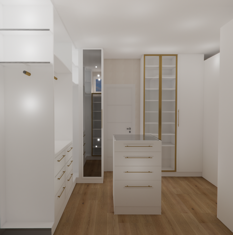 make photo realistic add natural bright lighting add shoes to the shelves in the cabinet with the gold doors