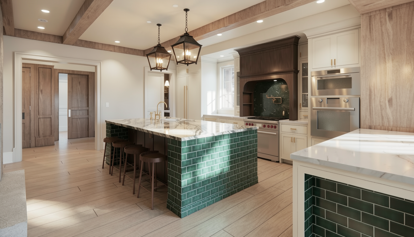 provide a fire pit in the middle of the furniture make a night time scene provide outdoor lighting with bulb lights hanging from the pergola make the pergola supports wood with trim around it show a 8 foot stucco barrier wall in between both units provide some plants on the patio area provide a water fall to the left of the entrance facing the opposite wall