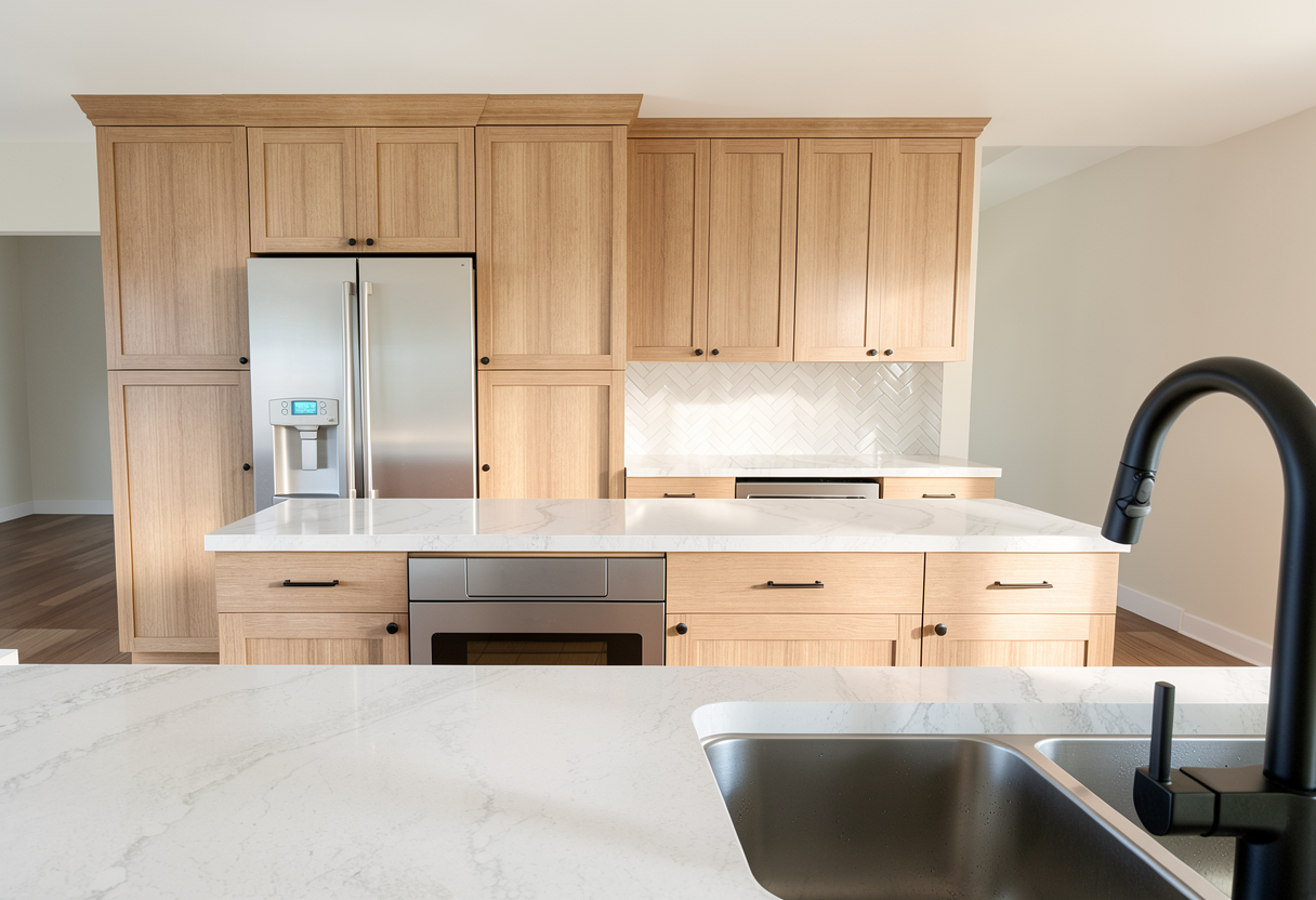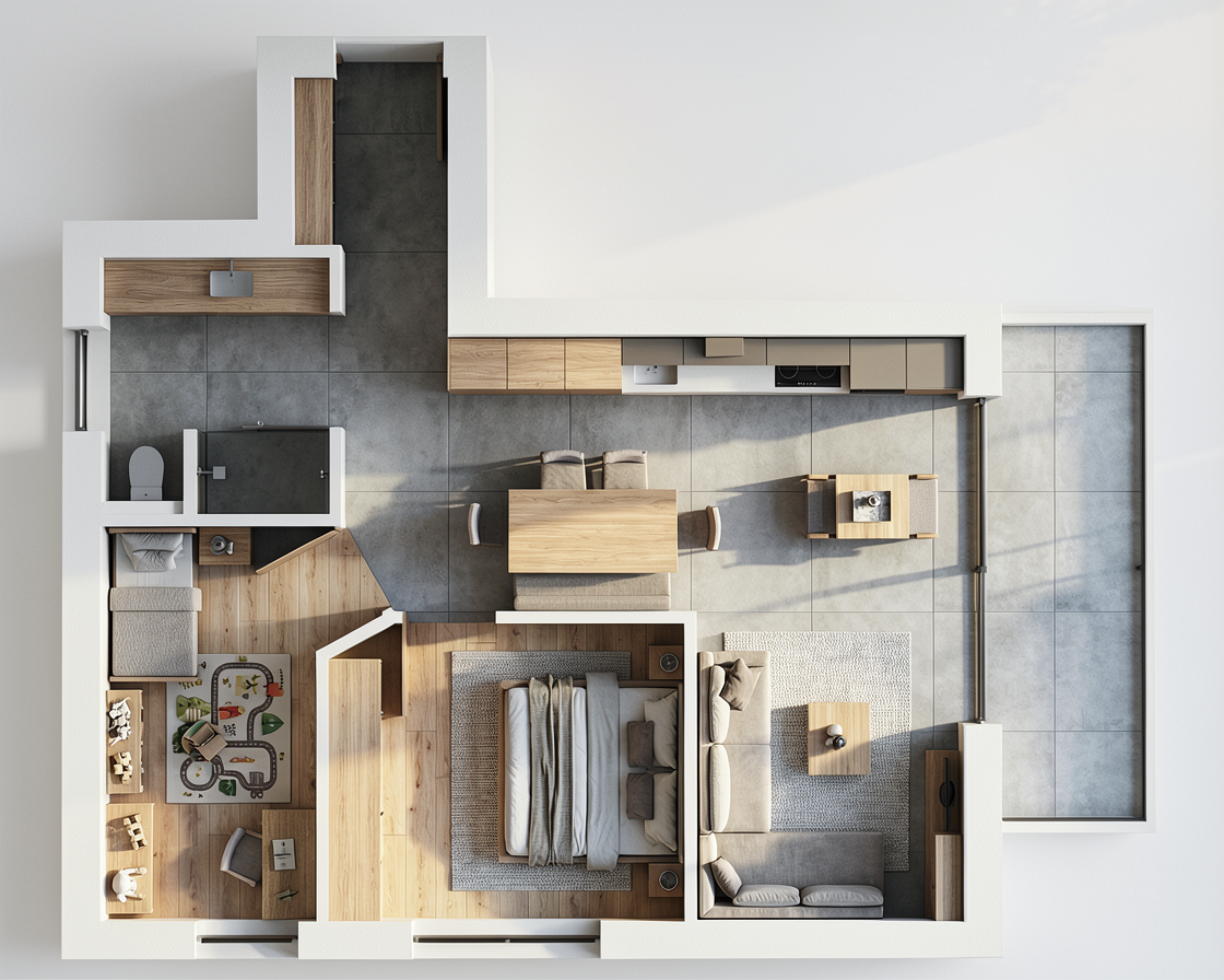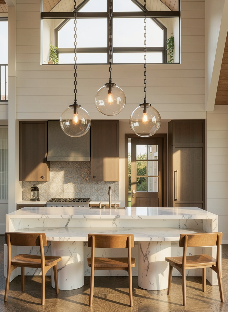 strictly preserve the original image and geometry exact same camera angle and framing no changes to architecture and any elements no modification to walls doors or openings keep all furniture exactly as is do not add or remove any objects no redesign no deformation preserve all original materials and colors no reinterpretation no new elements enhance only lighting and realism soft architectural photography style warm late afternoon ambient light soft diffuse shadows calm and balanced atmosphere subtle artificial ambient lighting only from the existing rattan pendant and ceramic suspensions lights warm soft glow realistic light diffusion no new light fixtures natural materials with subtle imperfections except the kitchen bar which is perfectly new and uni matt slightly aged wood with light patina realistic rattan texture with fine weaving detail natural irregularities and softness gentle texture variation no overly perfect surfaces rural outdoor background with fields inspired by the alsatian sundgau landscape soft natural horizon coherent with interior lighting visible only through existing openings no new windows or exterior views keep all the existing ceiling and the joineries in the same color of sketchup 50mm lens shallow depth of field slight film grain soft contrast natural color grading