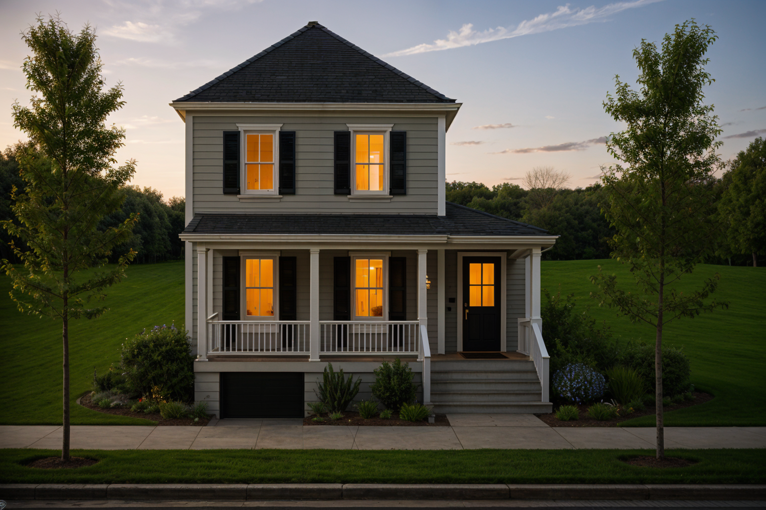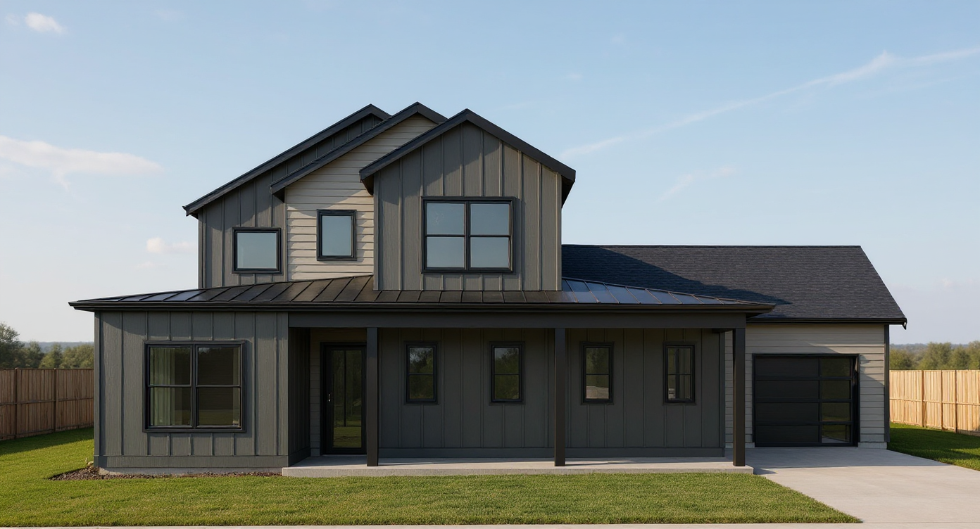 a modern two story house with a minimalist design the siding is a sophisticated charcoal gray with contrasting light gray for the smaller siding panels the windows are black with trim that matches the siding color the roof is a matte black complementing the overall color scheme the atmosphere is serene and contemporary set against a clear blue sky to provide a bright and welcoming feel with soft natural lighting highlighting the architectural lines and textures creating a harmonious and inviting ambiance low mountains in the background shrubs around the perimeter trimmed grass