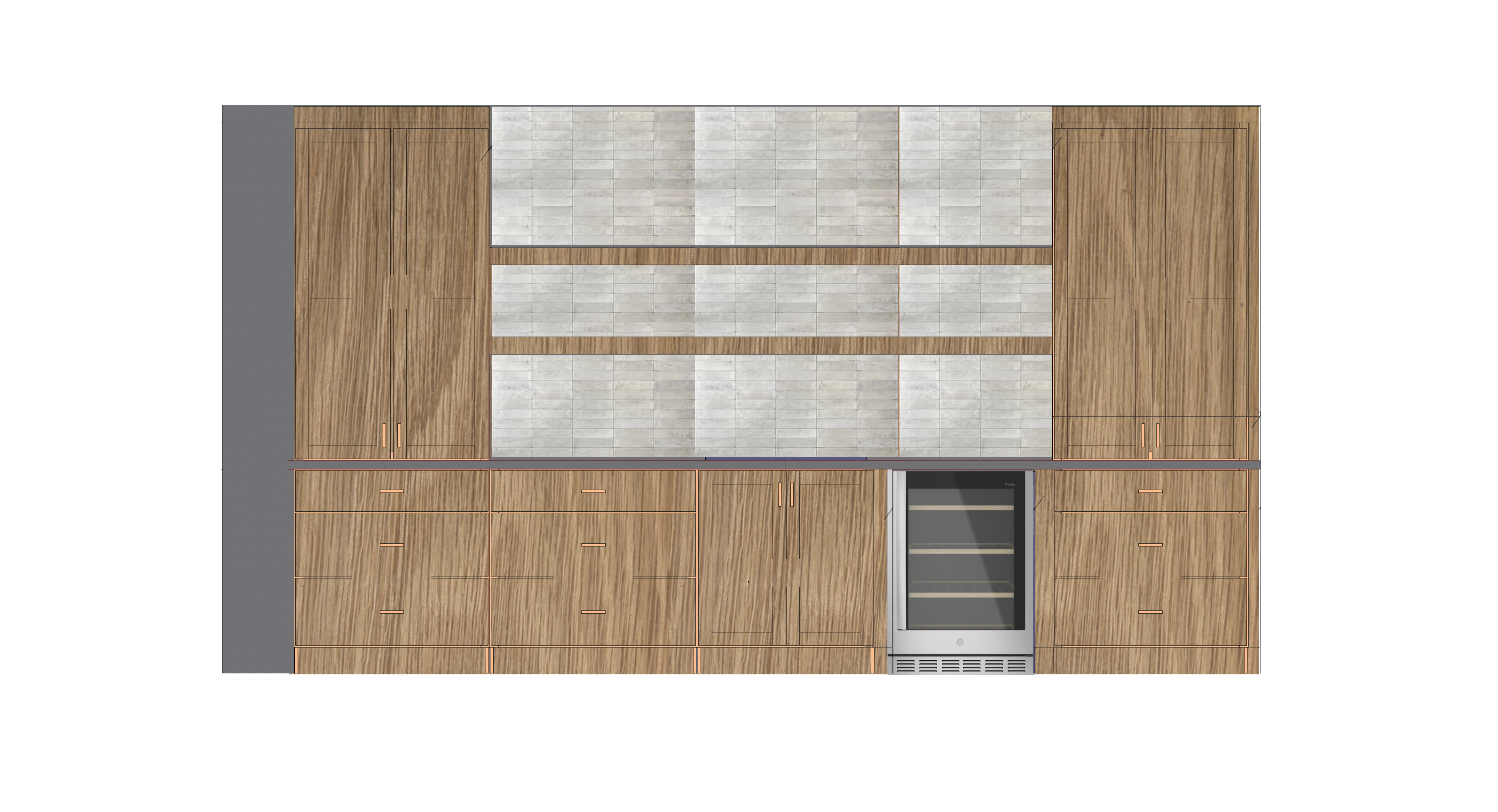 warm white oak wet bar with a light white oak floating shelves marble countertops on a sunny day
