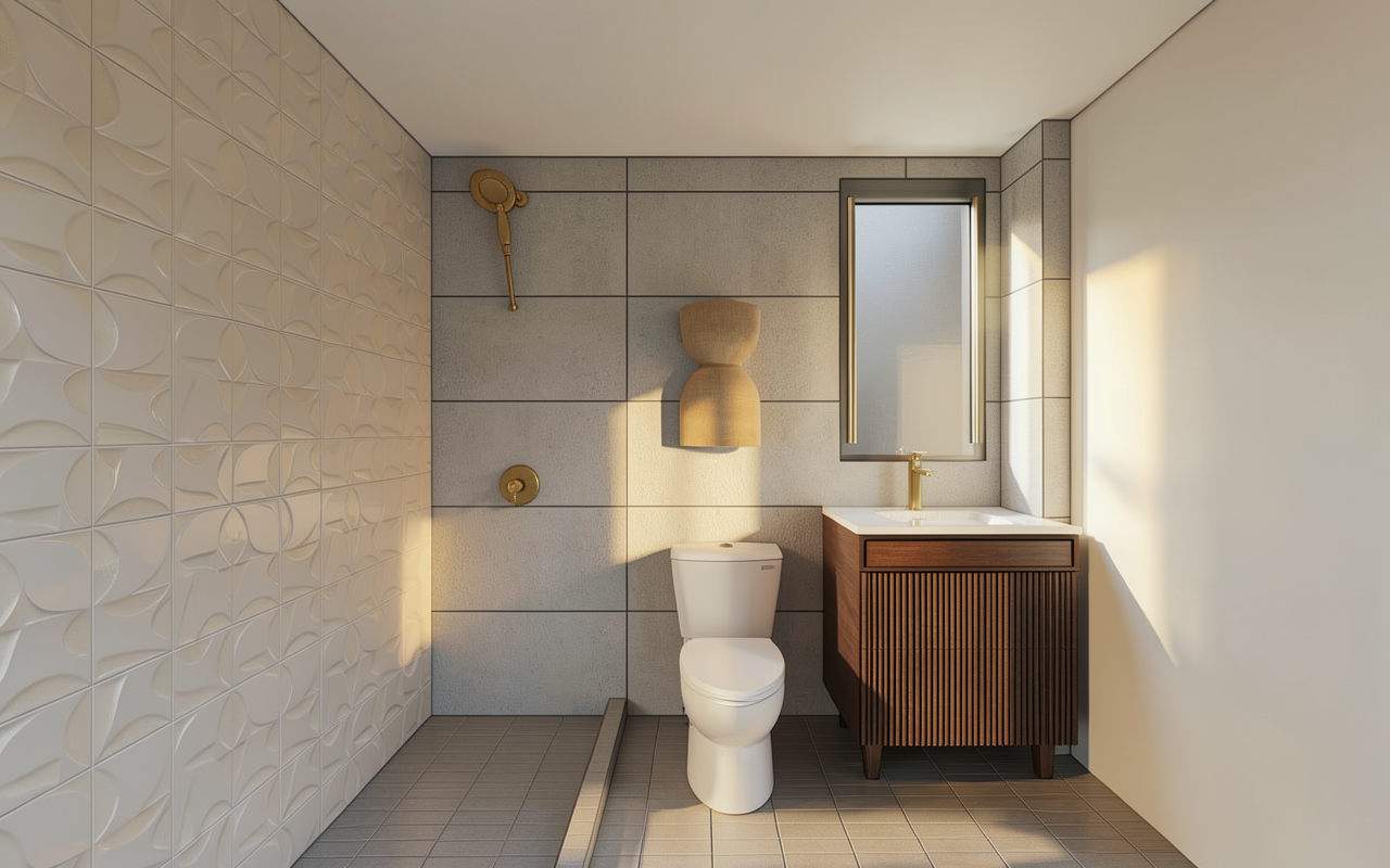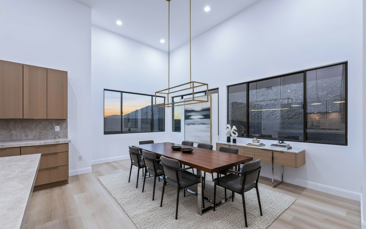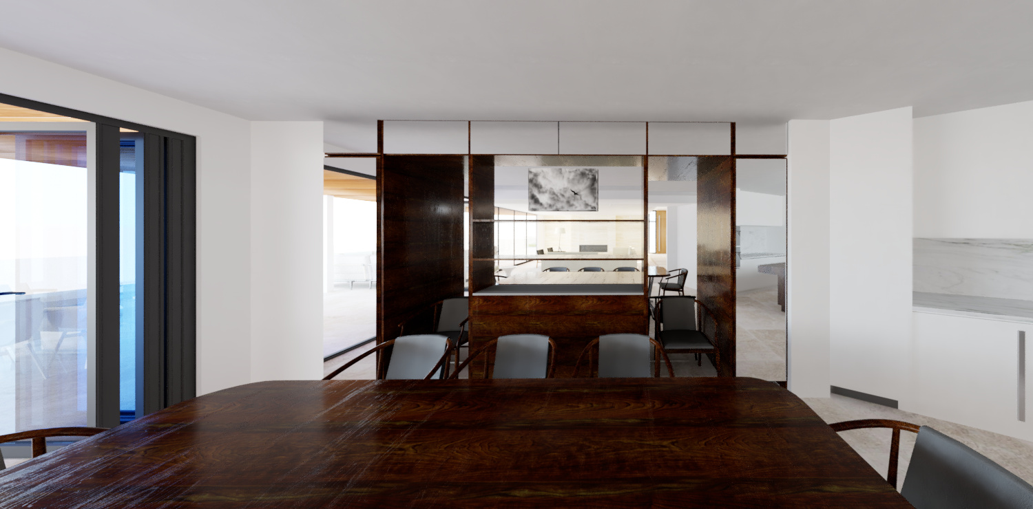 create a modern dining room and adjacent kitchen featuring a spacious walnut table surrounded by elegant walnut chairs with black leather cushions the atmosphere is warm and inviting enhanced by rich walnut and glass mirror cabinetry and there is an ocean view reflected in the glass mirror incorporate white walls and a light marble backsplash in the kitchen the kitchen cabinets are a white satin finish and color add a large window with black frames for natural light to flood in a bright airy feel the floor is light stone tile complementing the neutral palette