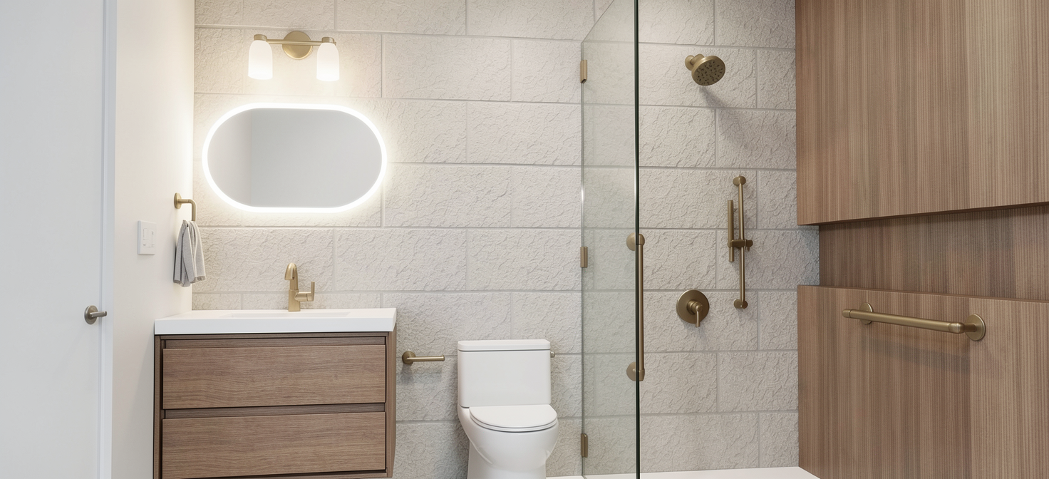 give the vanity and the wood slat like tile on the right side wall a subtle honey wood tone