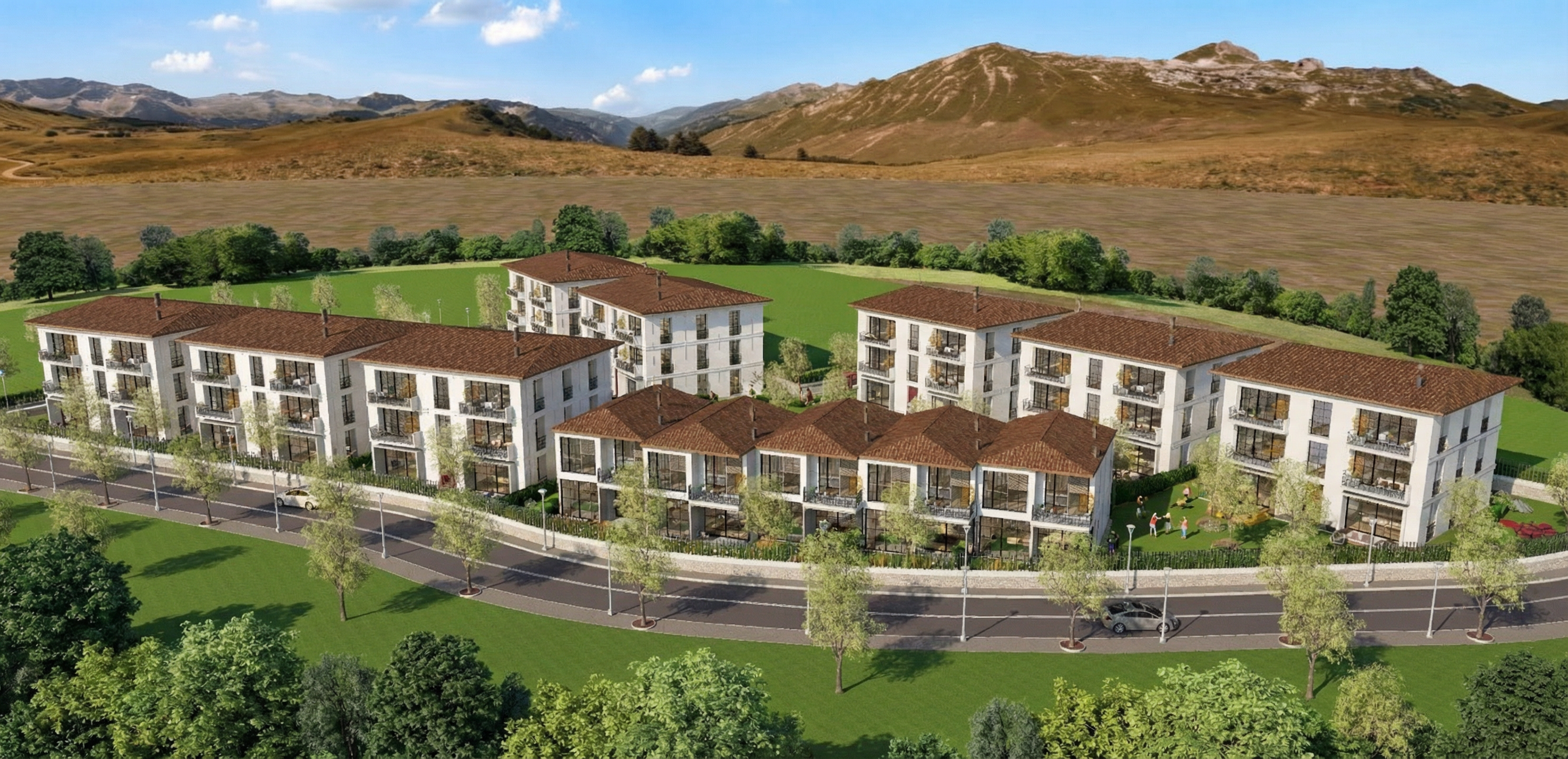 genau dieses rendering berarbeiten fotorealistisches foto exakt dieselbe perspektive und kameraposition wie das hochgeladene referenzbild 100 identische geometrie exakt gleiche anordnung exakt identische fensterpositionen mit gleichem ausblick durch die fenster weiches nat rliches tageslicht leicht schr g einfallende sonne durch die fenster r ume hinter den fenstern k nstlich ausleuchten sanfte realistische schatten realistische materialien echte texturen hochwertige oberfl chenreflexionen echte menschen echte autos pflanzen mit echten b umen und str uchern ersetzen gr ne fl chen mit wiese rasen und einigen b schen ersetzen sehr realistische umgebung nat rlicher himmel mit leichter bew lkung canon eos r5 35 mm festbrennweite f 2 8 nat rliche farbwiedergabe leicht warme farbstimmung golden hour feeling hyperrealistisch dslr qualit t raw aufnahme 8k aufl sung extrem scharf perfekte tiefensch rfe professionelle architekturfotografie das haus rechts mit produkt eternit swisspearl gravial in weiss einsetzen einteilung horizontal in egem abstand 1cm linienabstand in der h he im vordergrund rosenstr ucher