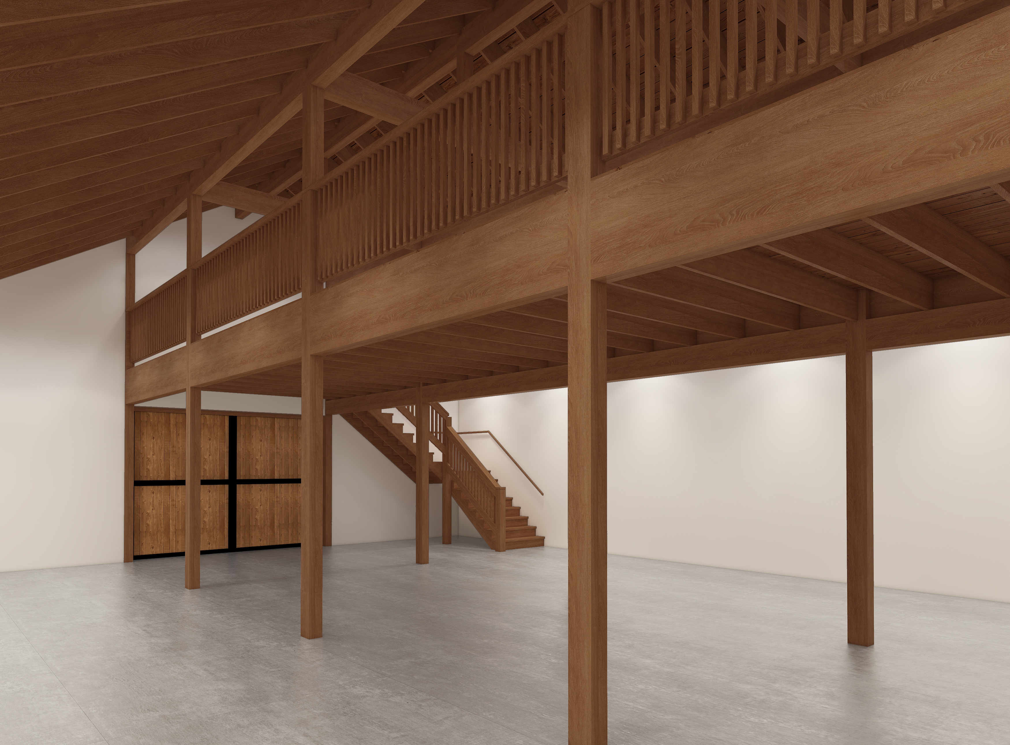 cinematic photorealistic garage interior transformed into a space with natural wood ceiling planks smooth concrete flooring softened by subtle warm reflections soft daylight filters in creating realistic light falloff gentle shadows and a calm contemplative atmosphere unusual for a garage setting