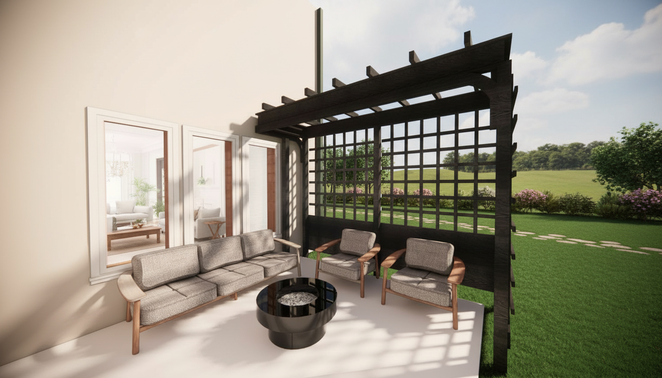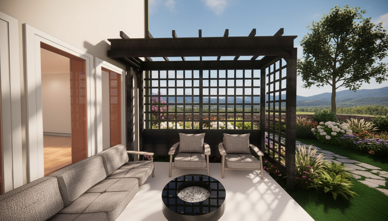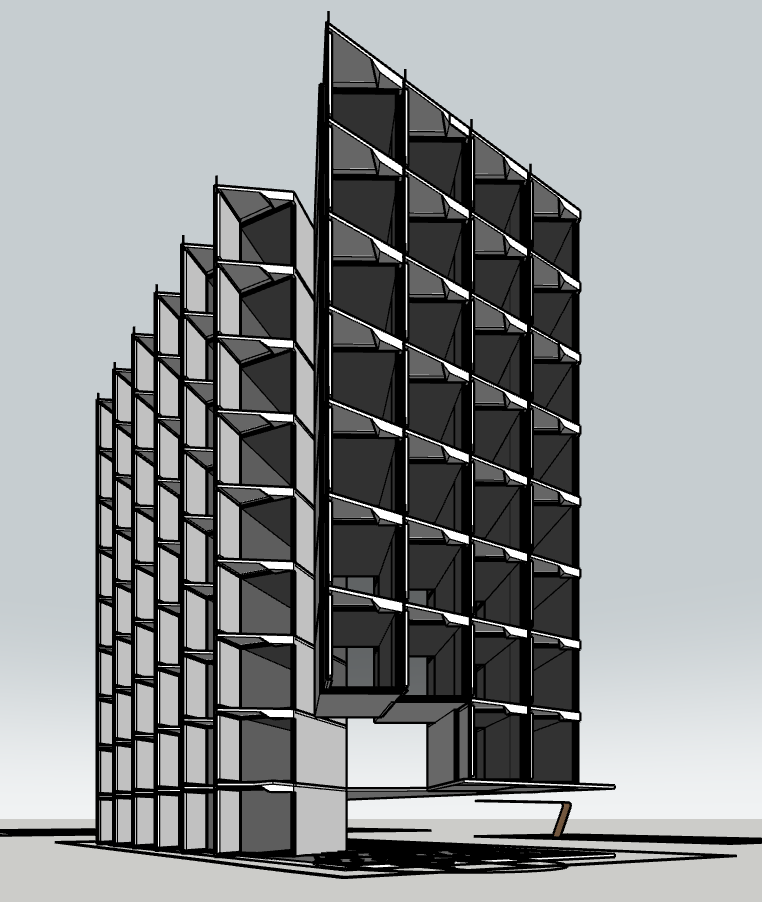render a modern architectural building with a minimalist design the facade consists of a geometric pattern with alternating light gray and dark gray panels accentuate the structure with sleek black window frames the background should feature a soft gradient sky transitioning from a pale blue to a gentle white near the horizon create a serene and futuristic atmosphere with diffused natural lighting casting subtle shadows on the ground add a reflection of the building on a smooth reflective surface below