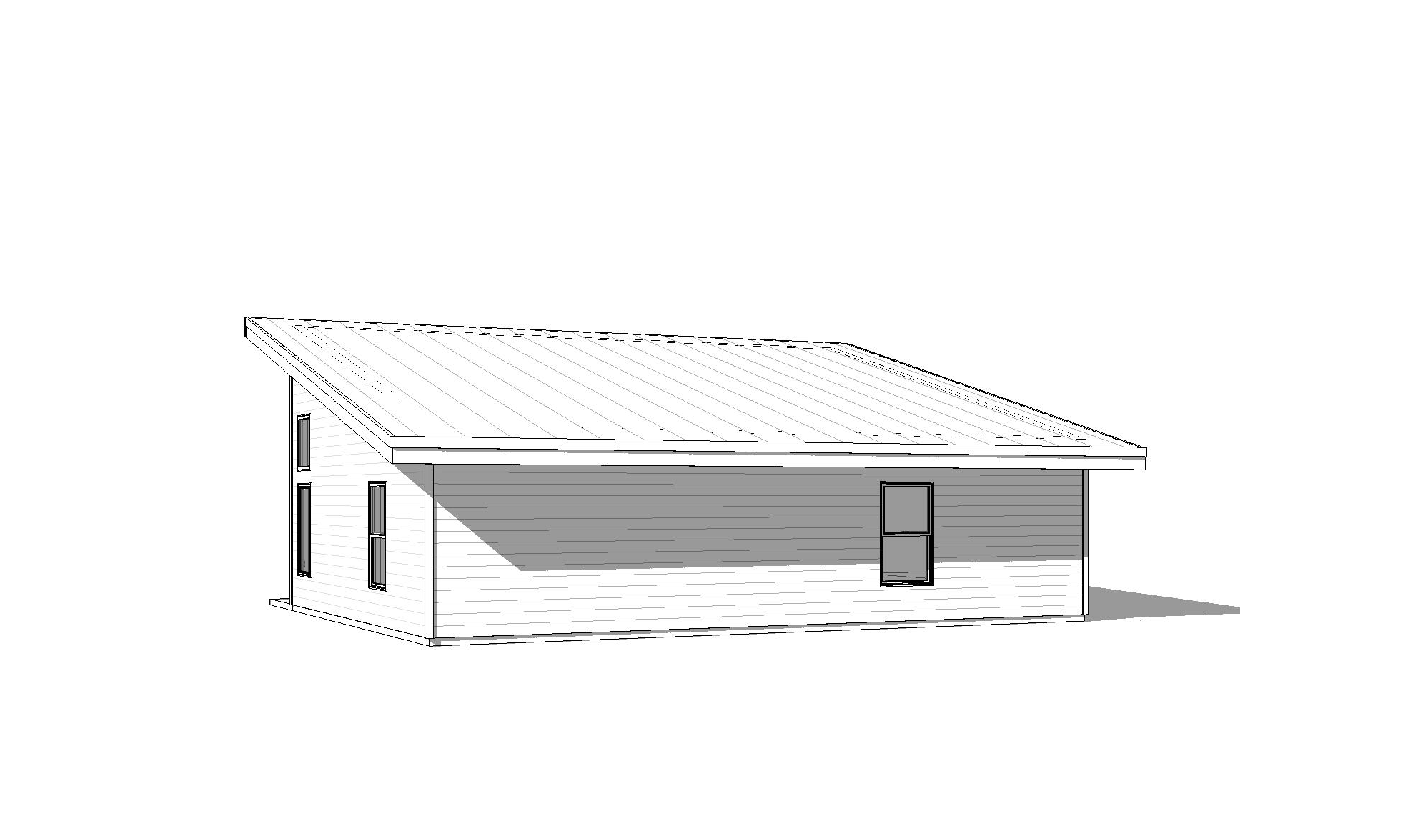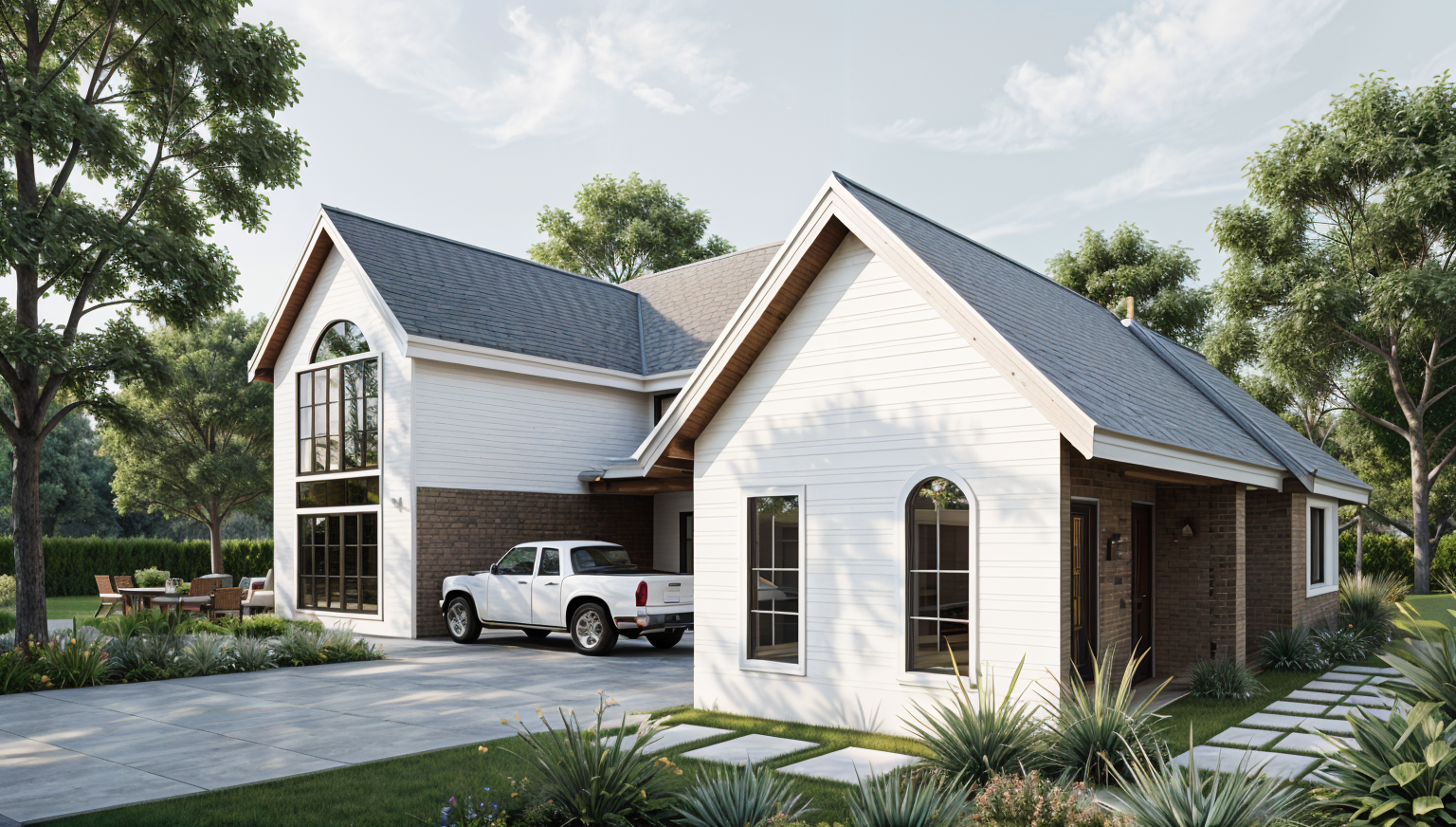 front view of a modern clean adu architectural exterior home rendered in cinematic vibrant dusk lighting with bits of blue skies and sunlight coming through the clouds adu in a dense neighborhood setting with faint streaks of light coming through trees in the surrounding area warm glow and reflections off of the windows blue sky with big billowy clouds clean white hardie siding green manicured landscape around structure with gardens and patches of grass black standing seam metal roof prominent trees in the background high fidelity photorealistic visualization crisp shadow falloff refined facade geometry soft atmospheric depth premium architectural photography mood ultra clean composition and materials black window trim photorealistic render small concrete path around the exterior of the adu hide concrete foundation grass in the foreground black window trim
