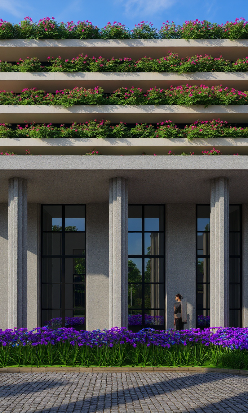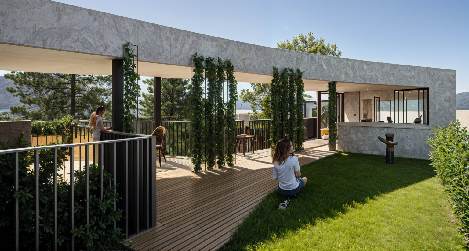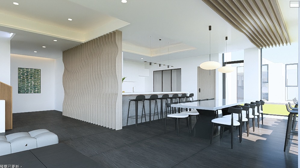 zaha hadid exterior shot luxury modern interior design spacious open plan dining and kitchen area featuring a wavy wooden partition in light beige elegant dark gray tiled floor and sleek black dining chairs with white seats around a long black dining table ceiling adorned with wooden slats matching the partition hosting modern pendant lights soft natural light floods through tall windows enhancing a calm and inviting atmosphere walls in crisp white subtle abstract artwork adds a touch of color the overall ambiance is contemporary minimalist with a harmonious blend of neutrals and natural textures architecture
