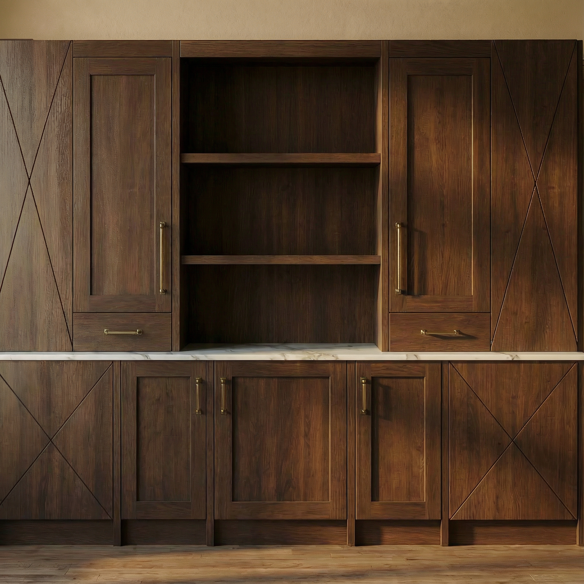 render it in white color cabinet add warm lighting inside the cabinet white marble countertop and backsplash wall paneling on the grey wall
