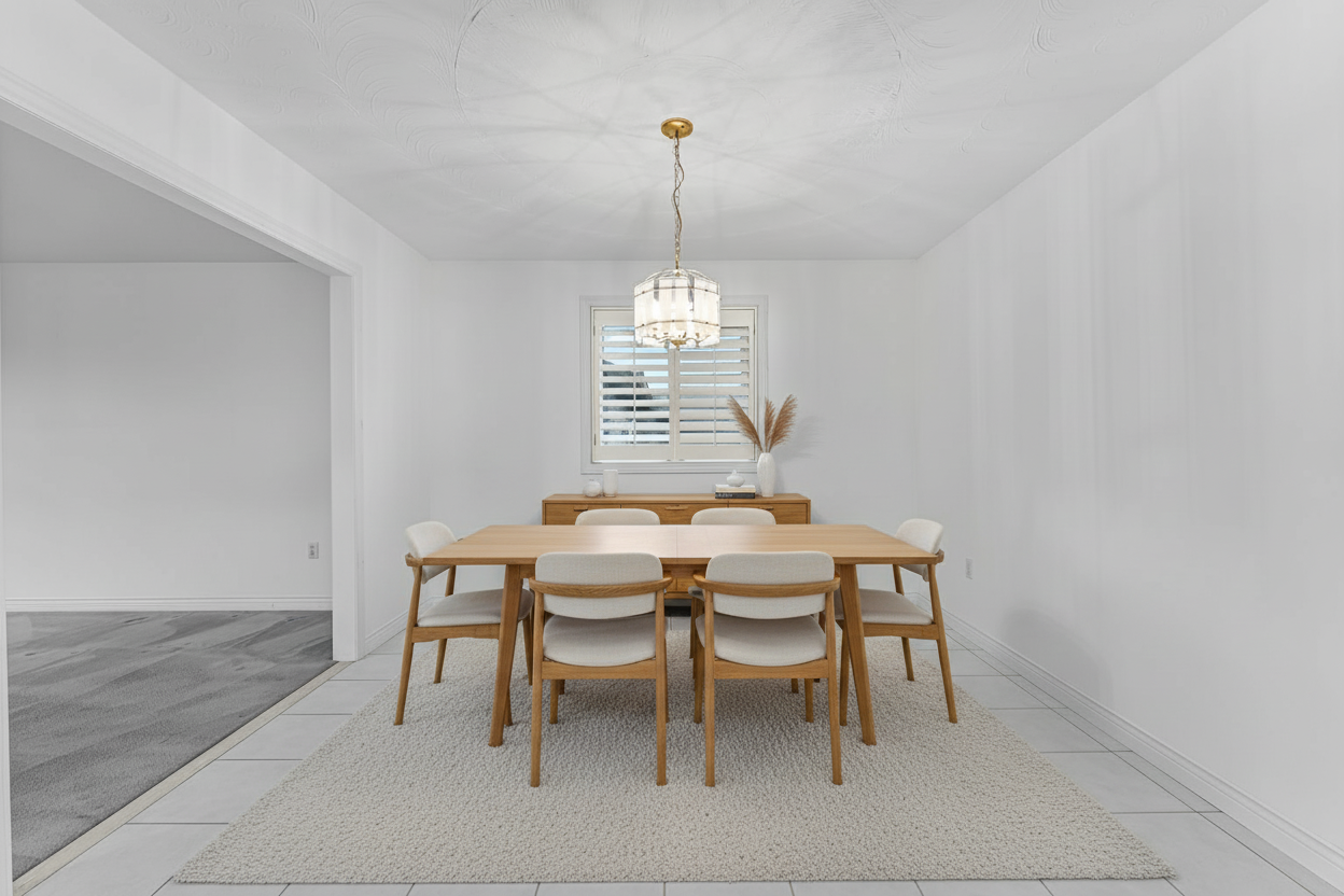 retain the floor colour and the window placement keep the structure of the room the same modern light furniture fill the room with furnishings large dining table