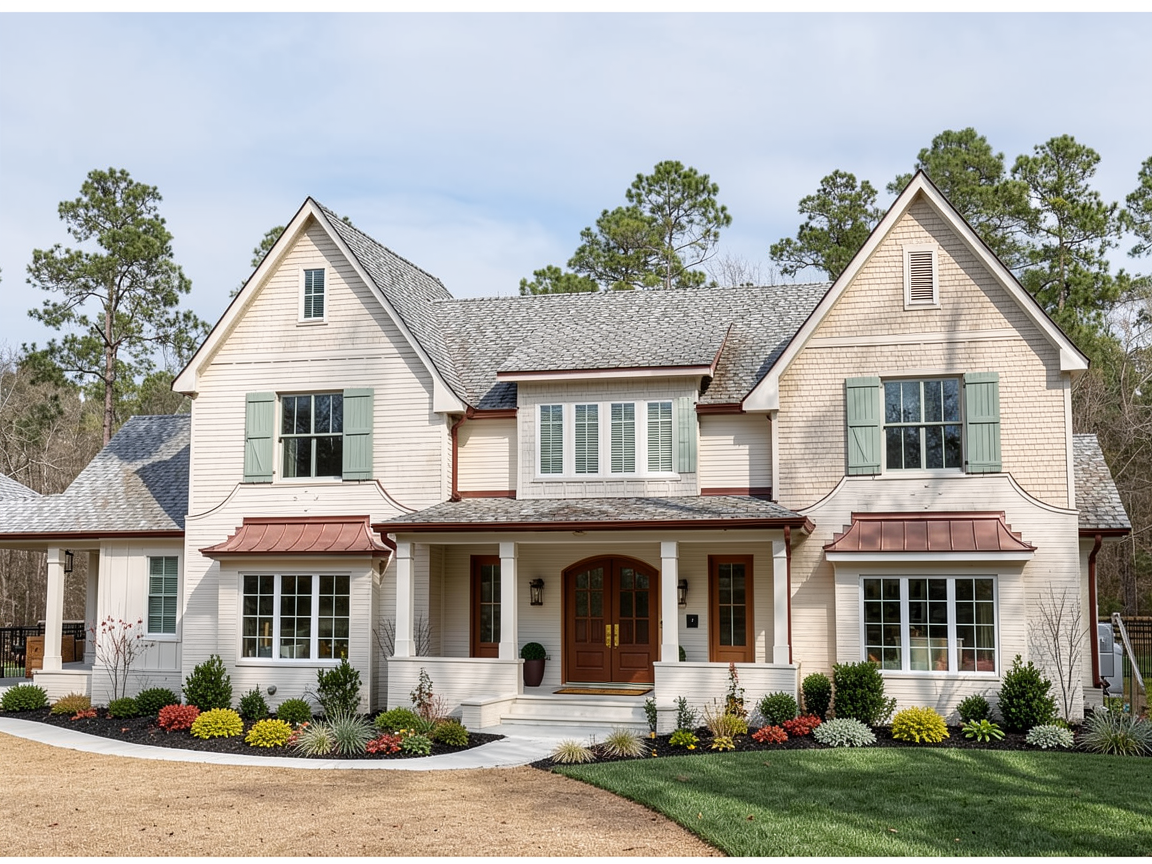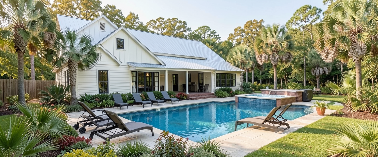 in the backyard add an in ground pool add an outdoor kitchen put contemporary reclining chairs by the pool i love putting the reclining chairs inside the pool in the bathing deck in the shallow end of the pool lots of high end pools have this an elevated hot tub at the other end of the pool see 2nd rendering let s make the yard a lot bigger this house will sit on several acres of cleared and manicured land white or very lightly off white exterior metal roof black framed windows these are in most new builds let s make the plants tress a little more tropical with palm trees palmetto pindo mexican fan palm european fan palm windmill palm crepe myrtles those are the trees in front of the house it s nice to use live oaks which are very symbolic of the south in the usa water oaks as well southern pine trees loblolly pine ground foliage