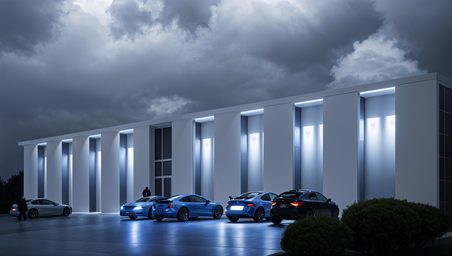 create a realistic architectural rendering of a modern urban street scene the primary focus is a contemporary building with a minimalist design featuring sleek gray concrete facade complemented by large reflective windows each floor has balconies adorned with lush green hanging plants adding a touch of nature the adjacent historic building is styled with red brick and decorative details showcasing a contrast between modern and classic architecture the scene is set during a sunny afternoon with the sun casting gentle shadows the sidewalk is animated with a few people enjoying a stroll and a parked dark blue car adds a sense of urban life the overall atmosphere is vibrant yet serene highlighting the harmony between urban living and nature