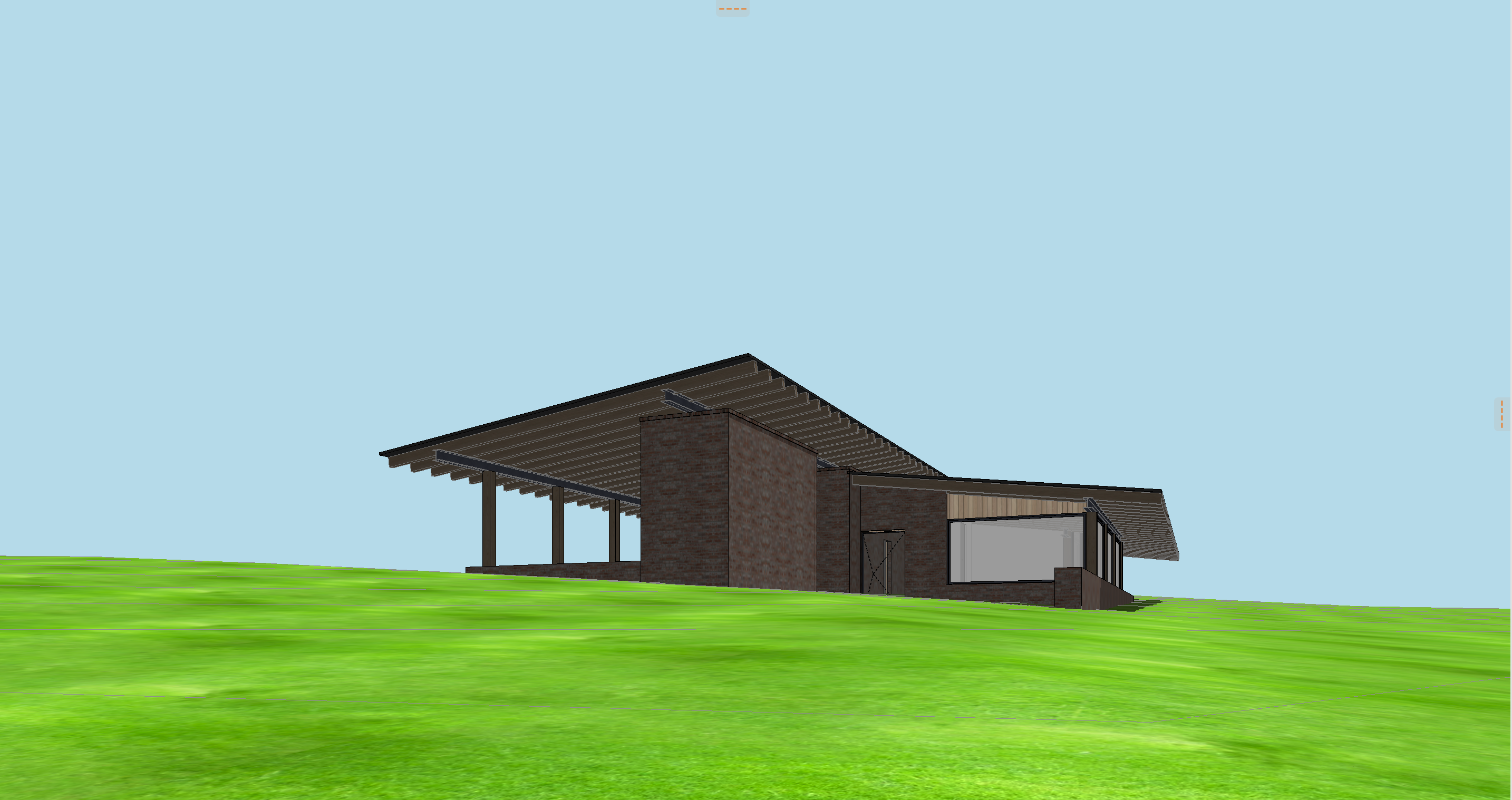 antique brick house with timber columns steel beams glass windows wild lousiana grasses and vibrant wildflowers all the way to house southern yellow pine trees in the background clouds in the sky all glass should be reflective not see through