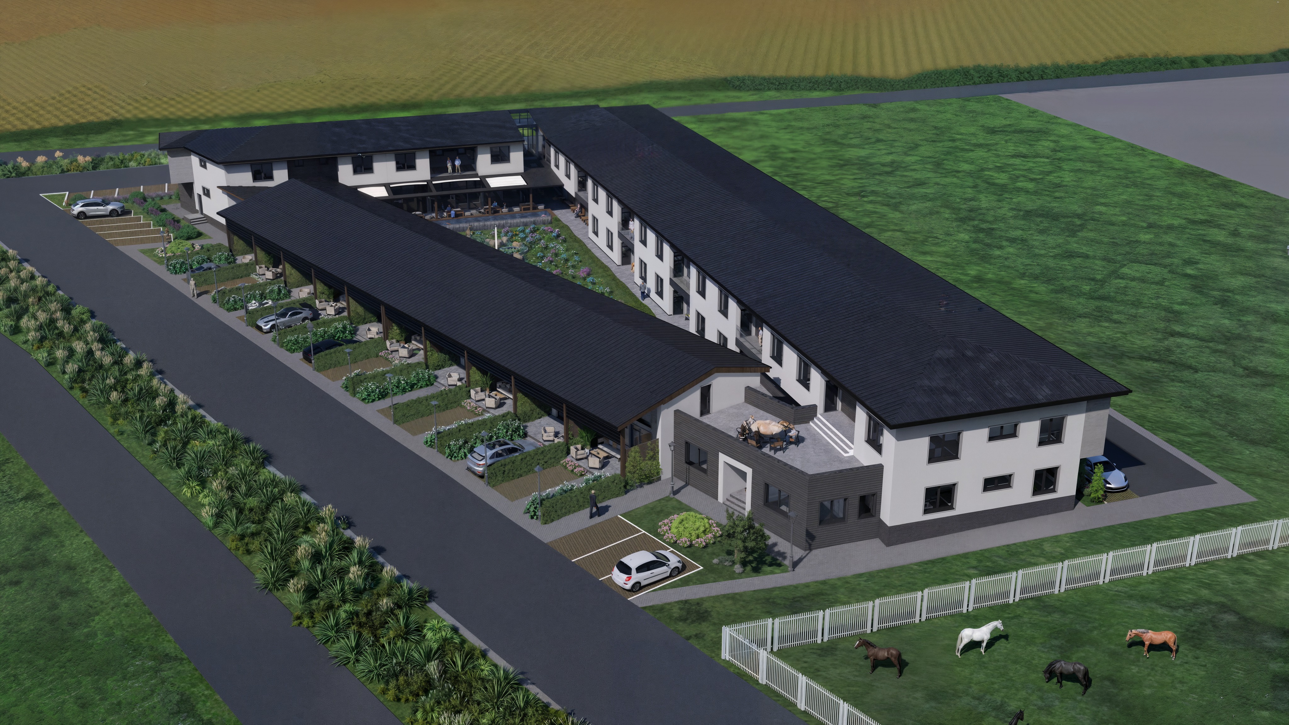 enhance photorealism with balanced natural daylight and improved light distribution increase micro contrast and ambient occlusion to better define edges corners and architectural details refine material realism subtle roughness variation more natural reflections on glass and cars and realistic response to light improve vegetation with more natural color variation softer transitions and reduced artificial uniformity slightly soften harsh contrasts and reduce overly dark or overly bright areas for a more natural look enhance overall sharpness and clarity while keeping the image clean and realistic keep the background natural and avoid introducing new patterns or artificial textures maintain a high end architectural visualization style preserve geometry composition and lighting direction exactly