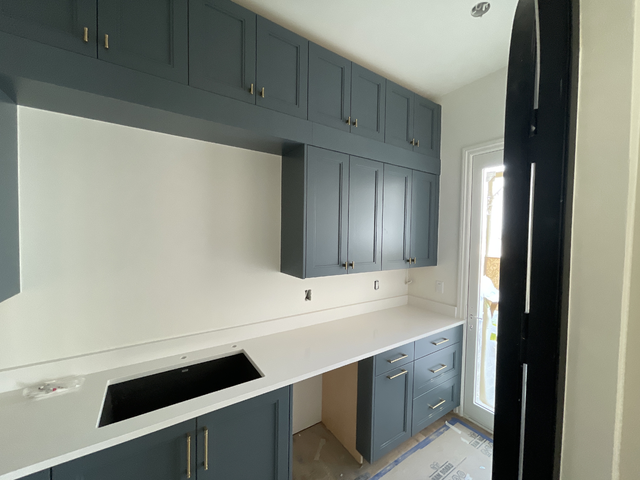 do not change the cabinets in any way preserve the exact cabinet colors materials finishes dimensions door and drawer styles hardware spacing alignment and all geometry exactly as shown do not alter the countertop shape backsplash appliances flooring lighting fixtures or wall structure only remove the construction materials clutter and mess from the scene clean the room and make it look finished and staged add a few simple tasteful home accessories appropriate for the style of the space but do not add or remove any furniture windows or architectural elements maintain the original lighting direction and realism enhance clarity and polish the photo while keeping the cabinetry and room design completely unchanged do not alter the lighting to keep the cabinet colors as they are in the image add a faucet to the sink put a picture over the sink add a dishwasher to the right of the sink stage for a pantry add flat crown molding