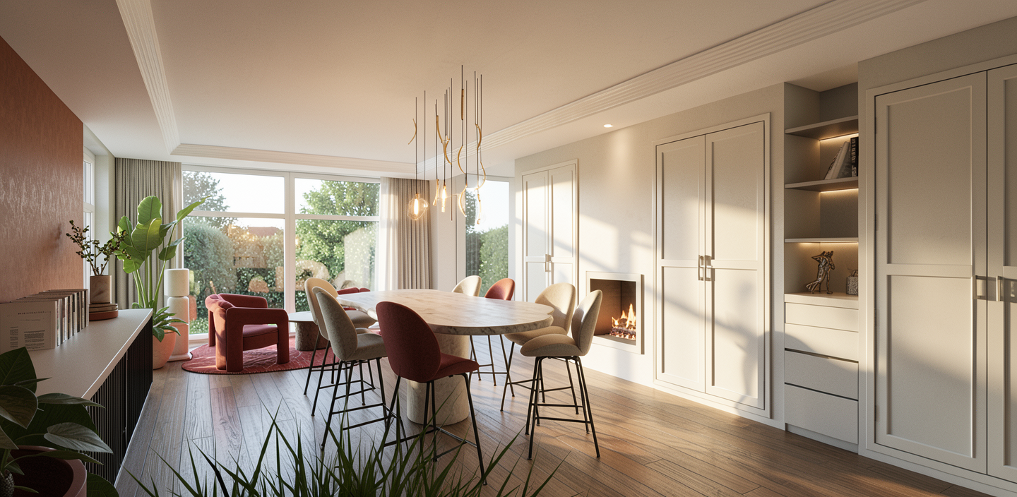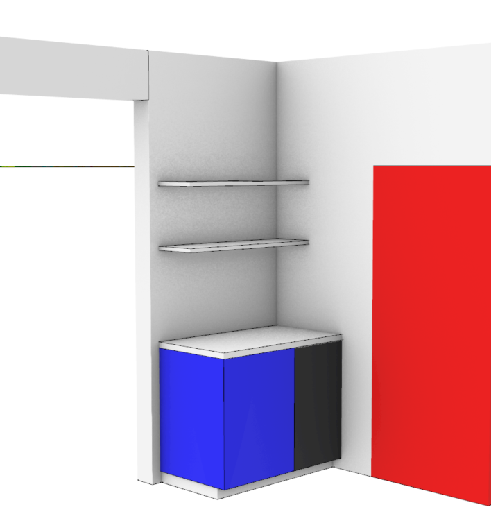 create a photorealistic interior rendering based on the provided reference image do not change the layout do not move walls door opening cabinets or shelves cabinet layout this is a corner cabinet installation on the right side of the corner is an 18 wide wine cabinet represented by the black to the left of the wine cabinet is a 24 flush mount cabinet represented by the blue both cabinets share one continuous white marble countertop above the countertop are two floating shelves surroundings the red wall on the right repersents a white door with white trim and molding make the walls white the left side opening leads to a kitchen and the refrigerator is near that opening do not focus on the kitchen keep the camera focused on the corner cabinetry