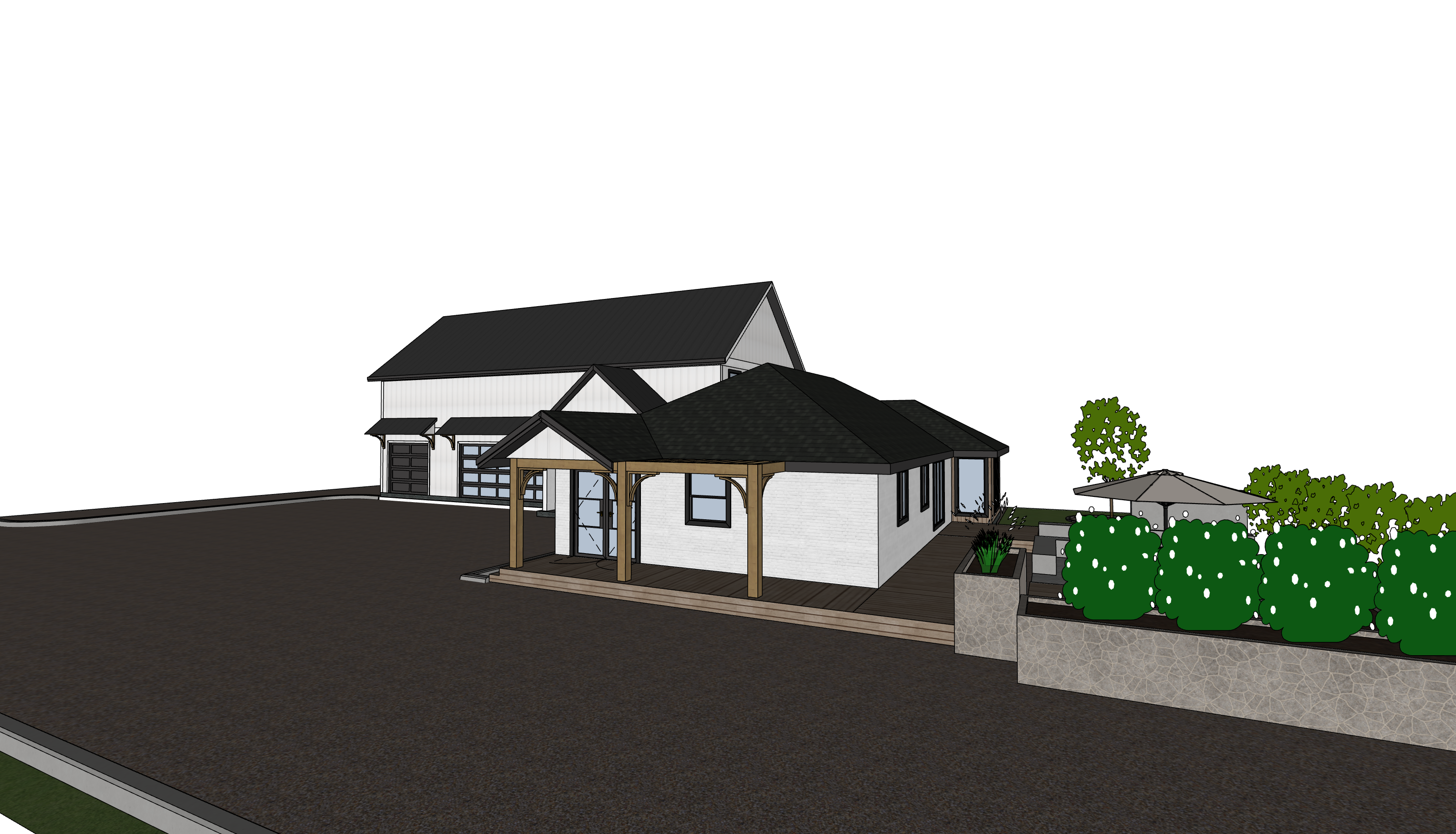 trees in the background right side of the property is the street left side of the property shows trees blue skies it will have gravel instead of concrete driveway the board and batten material will be painted in a creamy white color while the shorter building is going to have white painted bricks the roof on the taller structure will have a black metal roof while the shorter building will have charcoal colored asphalt shingle roofing the plant boxes will have decorative fieldstone rock