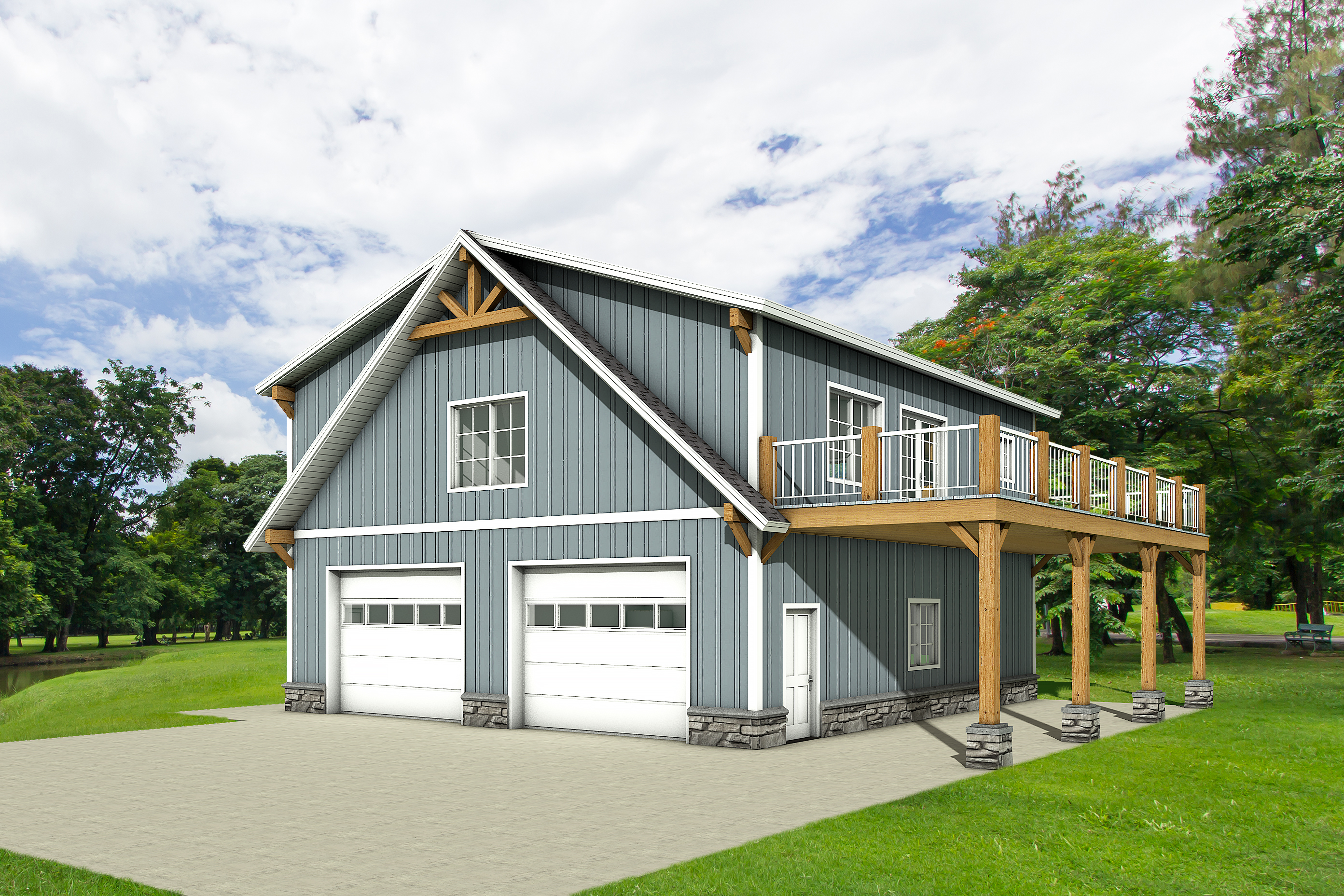 add photo realistic landscape and foliage with a mountain background keep the structure colors doors and windows just as the reference image shows the lawn is nice and manicured