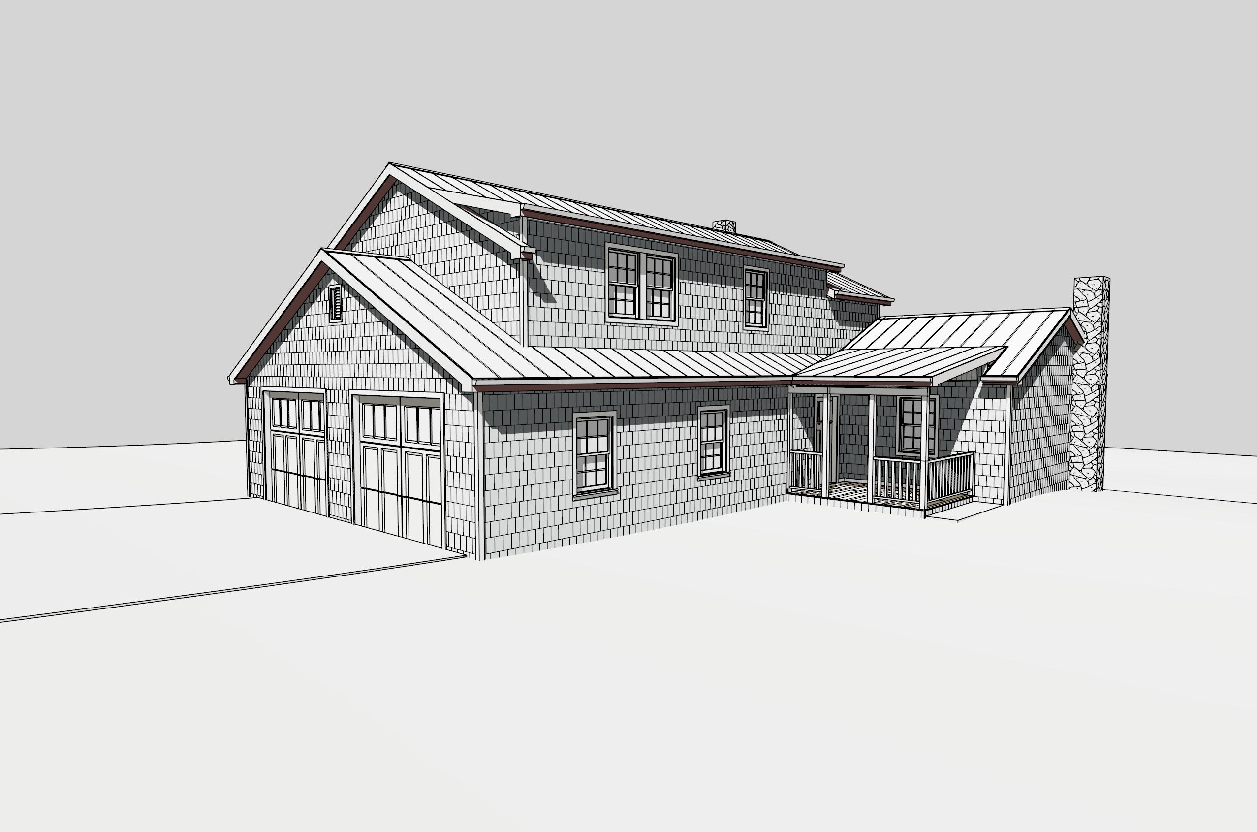 set in a forest add two garage door in end of house change light to late afternoon remove big trees in front