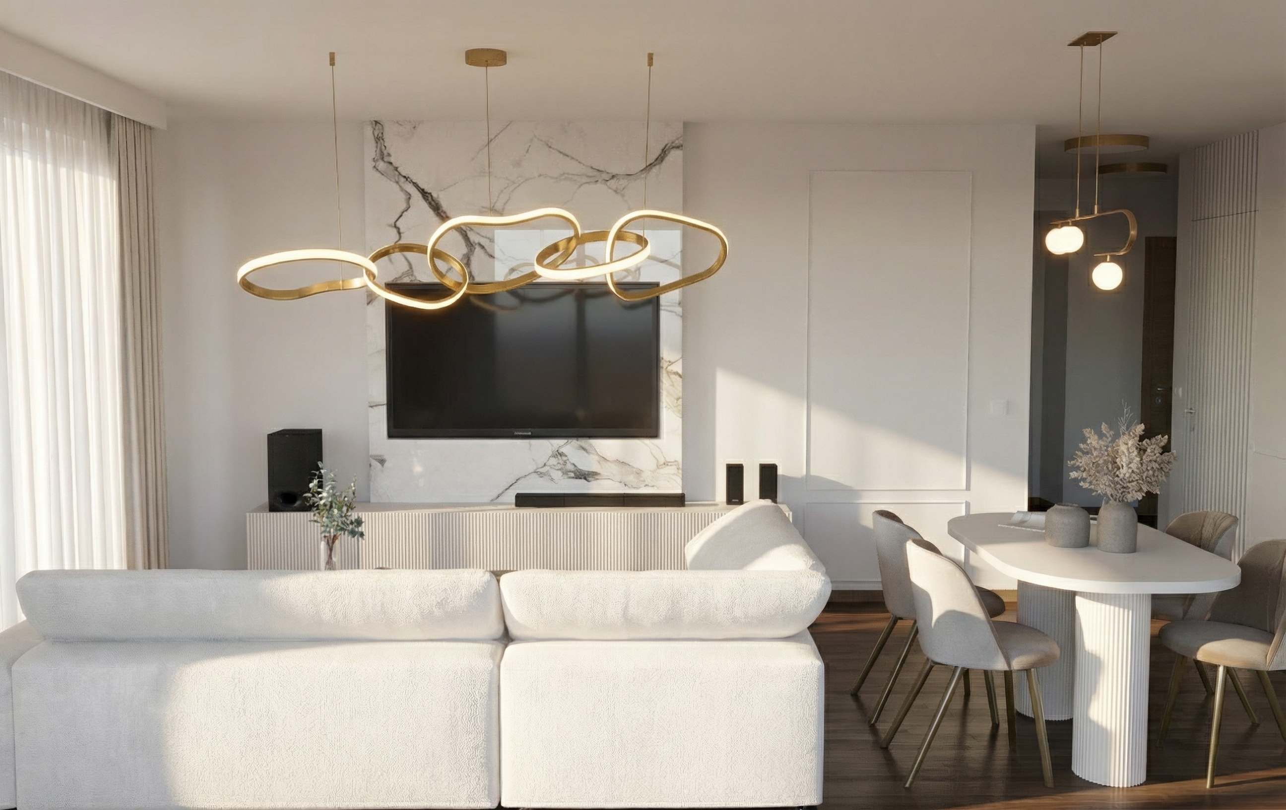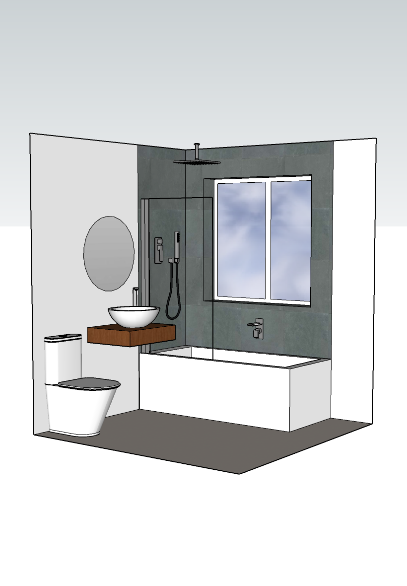 create a beautifully rendered modern bathroom scene the walls are a subtle off white contrasting with elegant dark gray tiles in the shower area the toilet and bathtub are a crisp white showcasing a clean and minimalist design the floating vanity is crafted from rich warm wood with a vessel sink on top mirrored round by a simple circular mirror natural light flows through a window with a view of a serene blue sky and fluffy white clouds casting a soft calming atmosphere the floor is a smooth beige with a matte finish the overall ambiance is modern and tranquil perfect for relaxation and rejuvenation