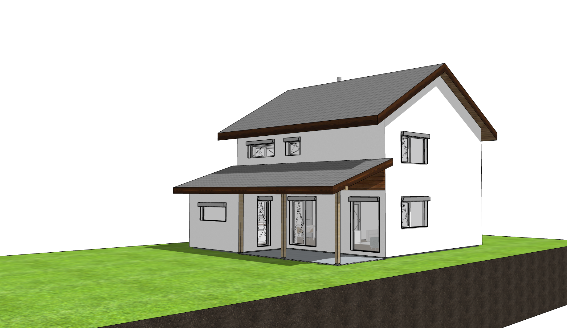 modernist exterior shot a modern two story house with a pitched roof and an extended porch the exterior walls are crisp white and the roof is a sleek charcoal gray wooden accents around the windows and porch area add warmth utilizing a deep mahogany brown the large windows reflect natural light creating an inviting atmosphere the surrounding landscape features lush vibrant green grass the sky is a clear azure blue enhancing the serene and peaceful ambiance of a sunny day architecture
