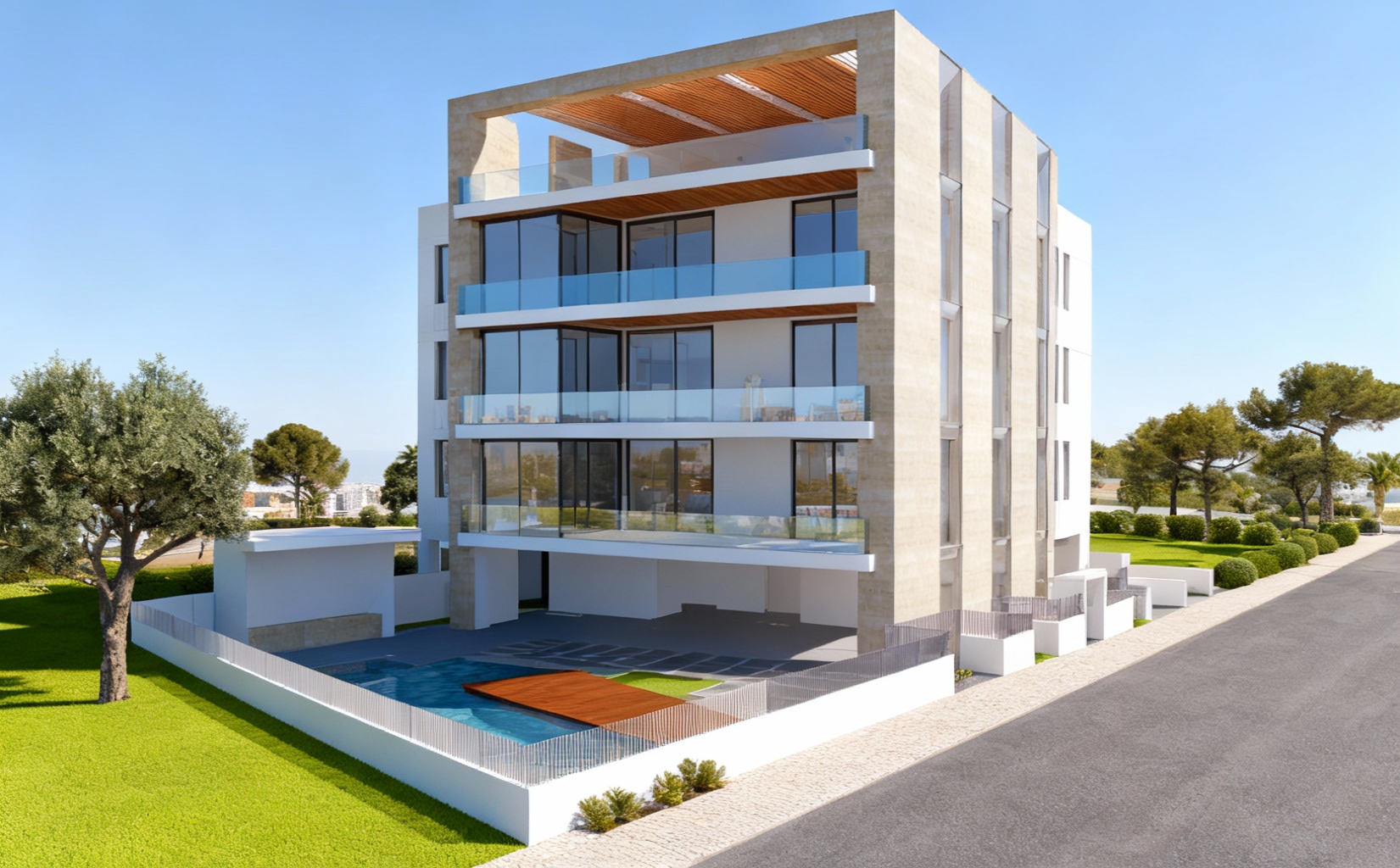 scene use the uploaded base model as the geometry and recreate it in a clean bright high end architectural visualization keep the building proportions balconies pool area bbq pavilion and fences identical to the base model follow the moodboard style for materials landscape and realism lighting bright clear daytime lighting with no sun visible in the frame soft even illumination across the entire scene no harsh long shadows no deep shadows no strong directional contrast remove all dark shadows on the foreground road building fa ade pool area and inner courtyard the lighting should feel like a bright mediterranean midday with a clean sky and diffused sunlight architecture pools and balconies should be evenly lit sunlight direction should be subtle and soft coming from outside the frame illuminating the balconies and pool without creating strong shadow edges sky must be clean bright and cloudless architecture replace all placeholder fa ade materials with realistic ones main exterior modern light beige stone cladding with soft horizontal texture limestone light sandstone travertine warm undertones matte seamless secondary white surfaces smooth clean white plaster balcony ceilings warm natural wood panels balcony railings transparent glass with realistic reflections window frames slim dark aluminum materials stone texture subtle and elegant no heavy patterning glass must reflect the bright sky softly wood must be warm and matte pool water clear bright blue with mild specular highlights landscape replace all empty terrain with organised maintained landscaping add trimmed green grass in the background add a small number of mediterranean city trees olive type or ficus type add neat shrubs along the pool and fence line no wild vegetation no dry bushes ground road add realistic light or medium gray asphalt road in front of the building keep the pavement clean with soft ambient light objects one modern car bmw on the road 4 5 people style photorealistic bright clean mediterranean residential architecture high end v ray corona style soft even daylight no dramatic shadows no sunset feeling restrictions no sea sea view do not change the building geometry do not change pool layout pavilion fence shape do not change the camera angle only improve materials landscape and lighting as described