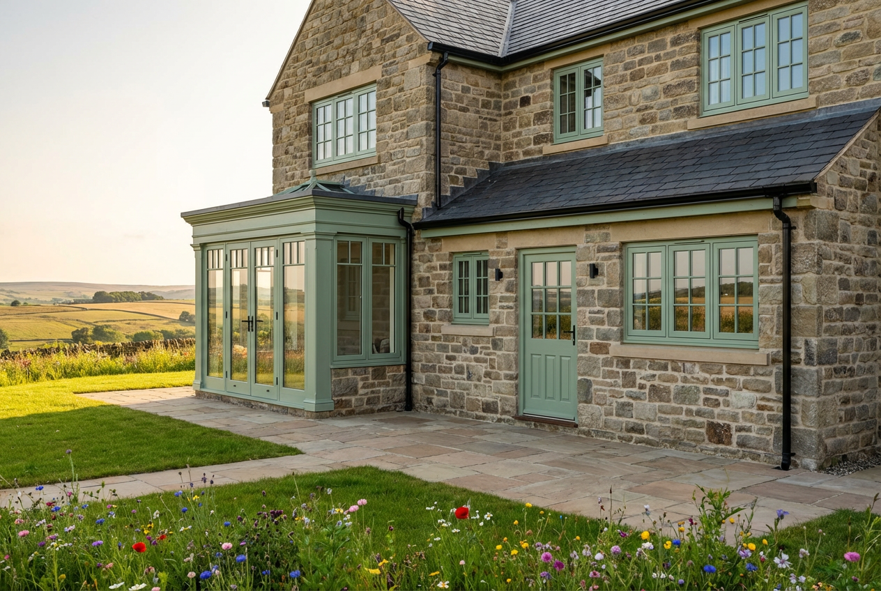 deconstructivism exterior shot i have drawn a roof plan front elevation and two partial side elevations to create a 2d photo realistic render the walls are a large natural stone the windows are farrow and ball vert de terre the door handles are black the guttering is black the roof tiles are natural slate there is a indian sand stone patio in front of the house with grass in front of that and some wild flowers the property is not surrounded by any other houses architecture