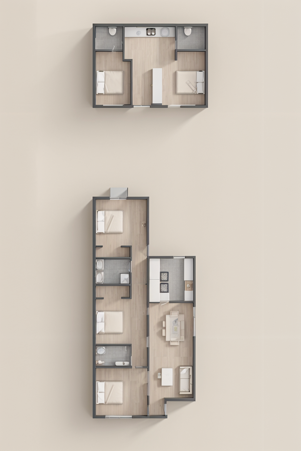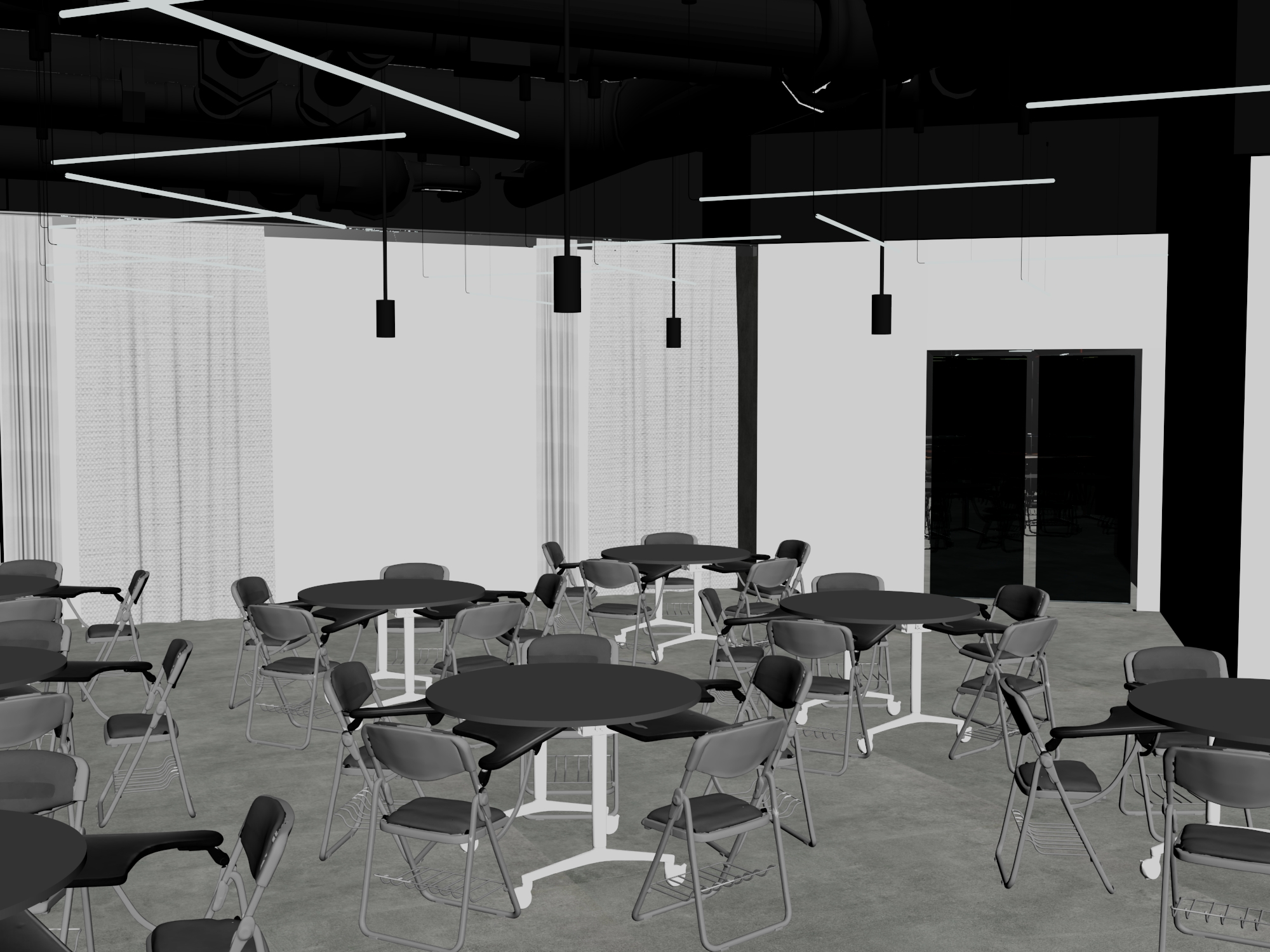hyper realistic architectural interior rendering of a contemporary classroom learning space with an industrial modern aesthetic the room features a smooth polished concrete floor and an exposed matte black ceiling with visible hvac ductwork conduits and suspended infrastructure the ceiling is illuminated by linear led light strips actively emitting cool neutral light at 4000k arranged in an angular staggered composition across the ceiling plane additional ceiling mounted black cylindrical pendant downlights hang from thin black cords emitting warm accent light at approximately 2700k providing subtle localized illumination without altering the overall lighting balance the classroom is furnished with multiple round black tablet desks arranged for collaborative group learning tables are supported by light colored structural bases and evenly spaced to allow circulation and flexibility seating consists of ergonomic classroom chairs with black fabric seat upholstery and dark grey powder coated metal frames including legs and structural supports chairs maintain a matte finish and realistic proportions positioned naturally around each table white transparent mesh curtains span sections of the perimeter wall acting as soft spatial and acoustic elements the mesh fabric is finely woven translucent and neutral in tone allowing light transmission while gently diffusing illumination without color shift wall surfaces remain minimal and light toned reinforcing brightness and contrast against the black ceiling lighting behavior is physically accurate featuring global illumination realistic falloff soft shadows and correct interaction with concrete metal fabric plastic and mesh materials ultra high detail photorealistic pbr materials real world scale balanced exposure cinematic depth neutral color grading no color changes no material substitutions no stylization