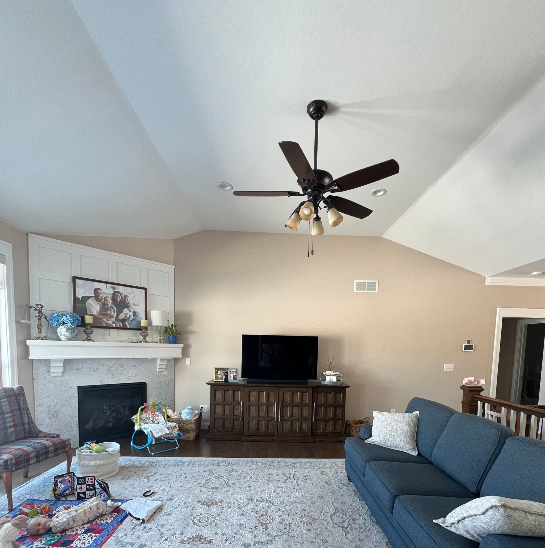 remove all baby items add 2 beams on the tape lines of the ceiling change the marble on the fireplace surround to stone