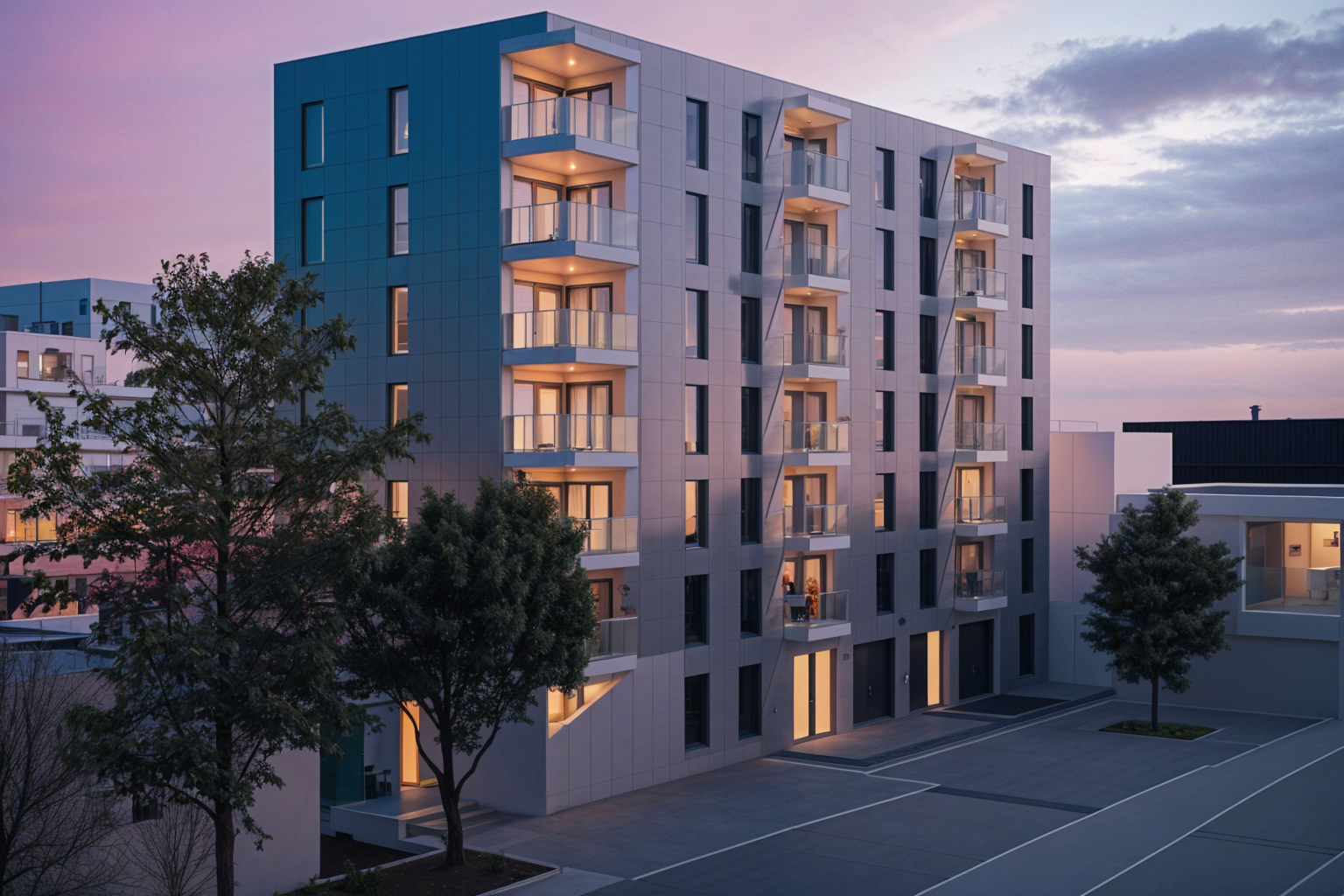 minimalism exterior shot with sunset and clouds ground with grass architecture