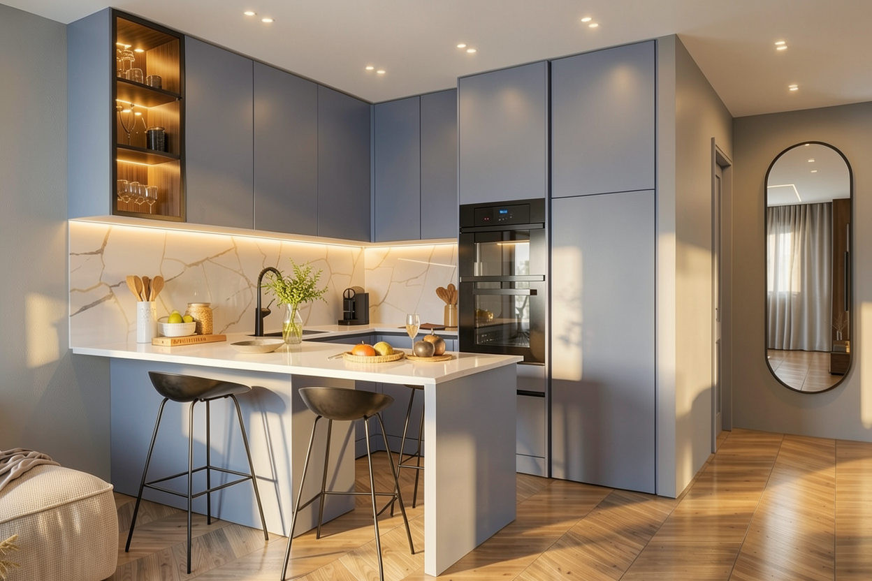 photorealistic interior render of a modern arabic majlis living room morning lighting feature wall with three pointed arch niches central arch filled with a zellige style mosaic wallpaper in teal blue and white diamond pattern lit by warm concealed uplighting the other two arches on the sides contains mirrors low profile modular sofas in cream light linen arranged in a u shape around two wood carved wood coffee tables with arabic dallah coffee pots large arched window with brass frame on the right wall deep blue twilight sky visible outside warm interior light reflecting softly on the glass statement multi arm chandelier with cylindrical glass blue and beinge colors recessed ceiling in white with glowing cove detail limestone paint in sand area rug is beige with blue accent color details tall indoor tropical plants flanking the feature wall mood intimate luxurious candlelit editorial no people no text no visible ac unit camera 24mm wide angle lens equivalent camera positioned in the far left corner of the room shooting diagonally toward the feature wall camera height 100cm from floor low to honor the majlis seating scale slight upward tilt of 5 8 degrees to capture ceiling detail without aggressive distortion correct architectural proportions vertical walls must be straight no fisheye warping