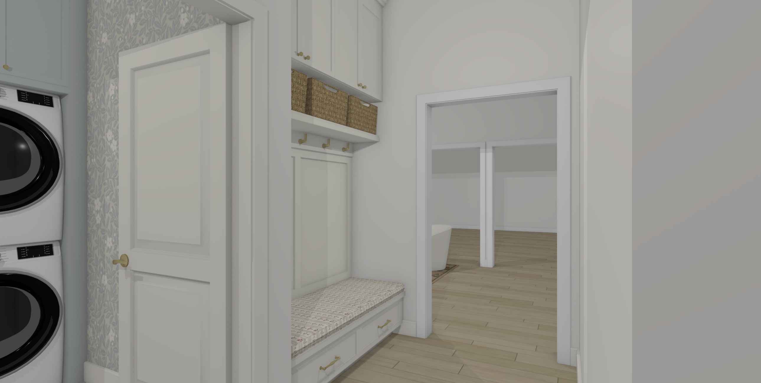 don t change anything don t change the cabinets render with natural lighting add coats hanging on hooks under baskets