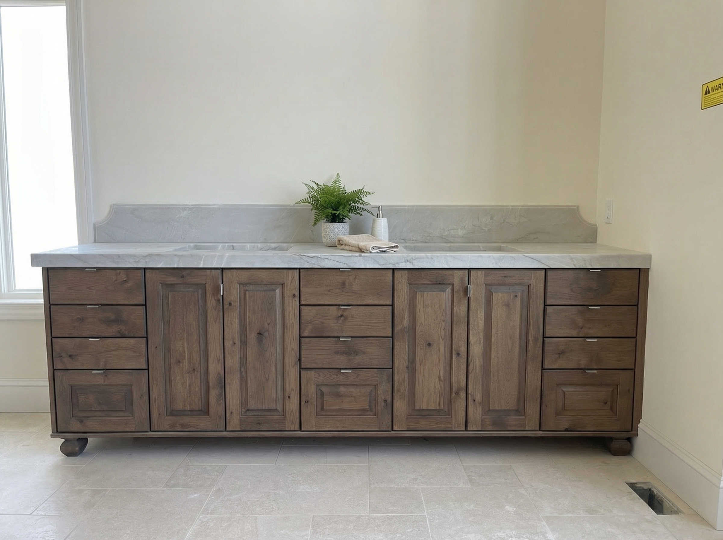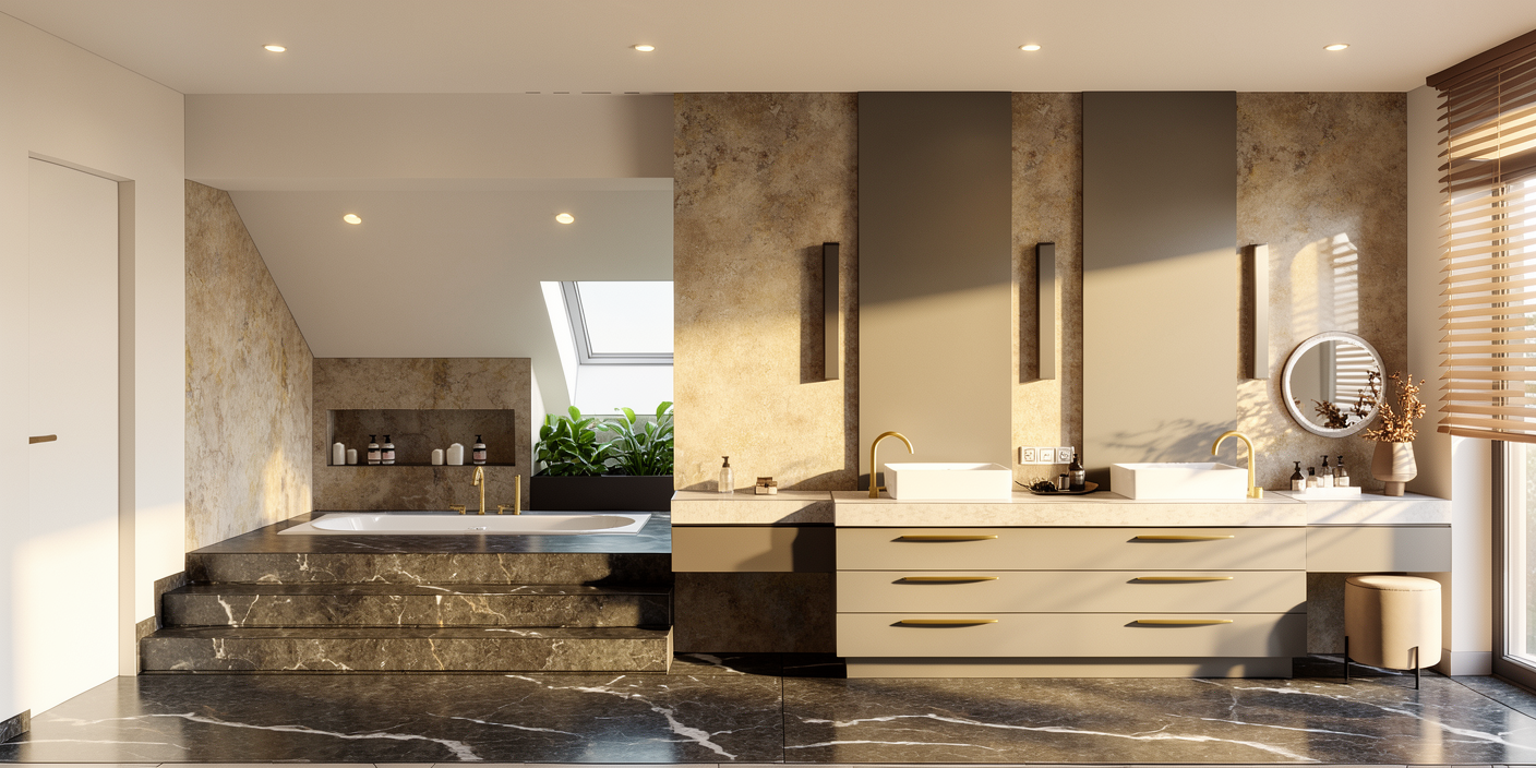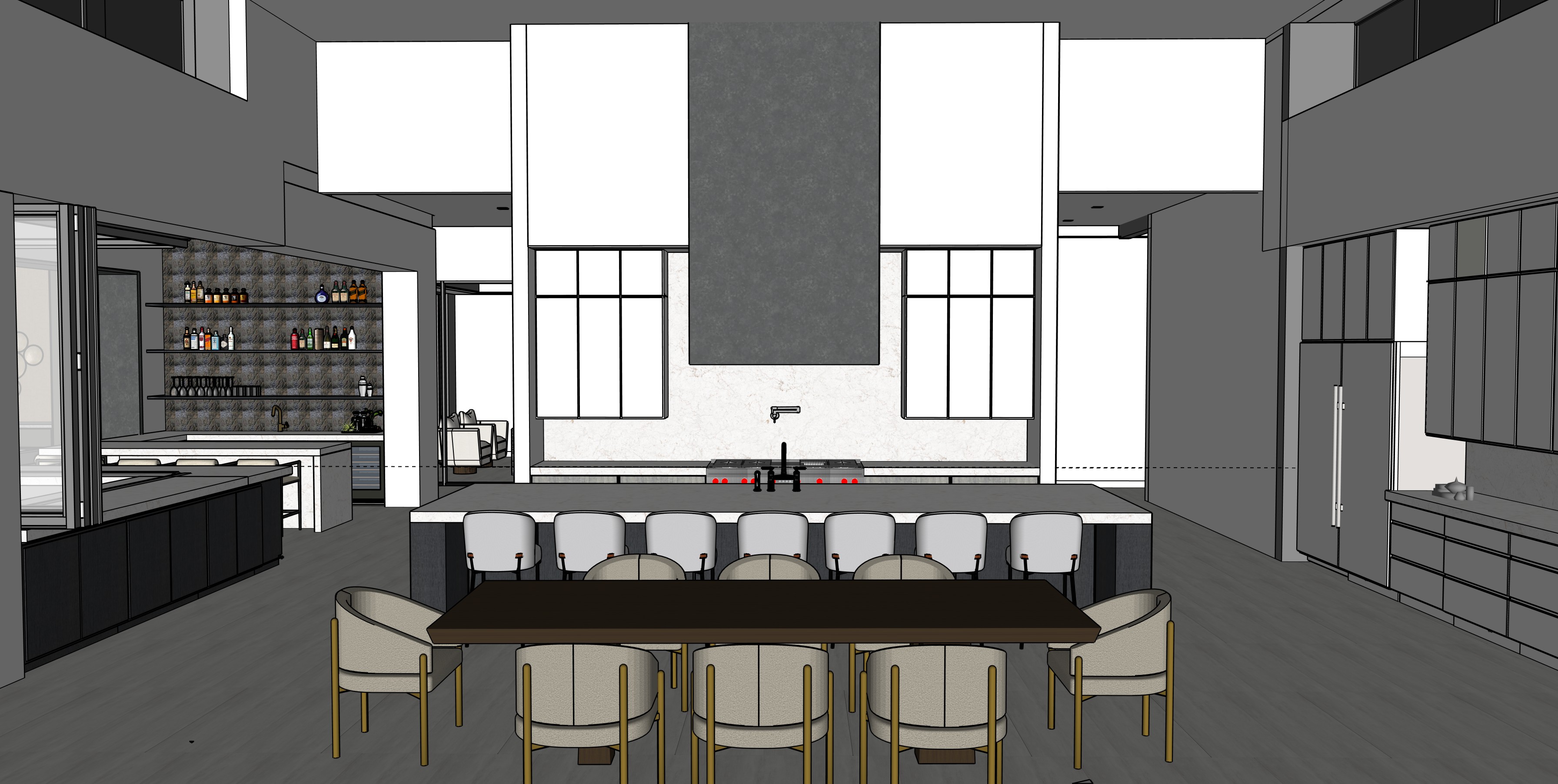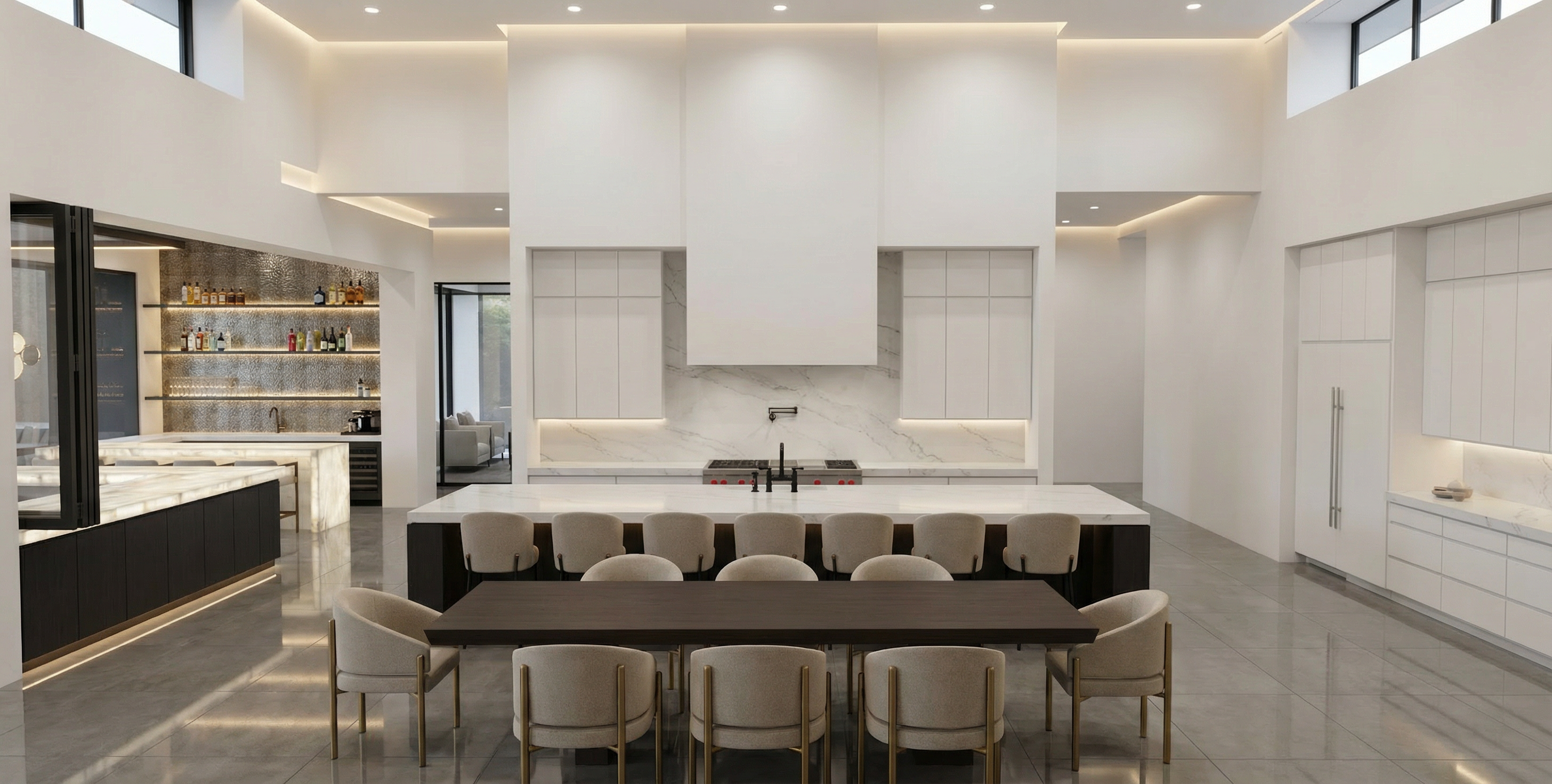 render an ultra modern kitchen interior with high ceilings include sleek white walls and cabinets contrasted by a pristine white quartzite countertop with soft veining the hood is a dark cold rolled steel add warmth with a deep espresso colored dining table and island cabinets and upholstered chairs in a soft beige accented by golden legs illuminate the space with soft ambient lighting for a cozy yet sophisticated atmosphere on the far left you see a bar with charcoal cabinets white onyx counters that are backlit and a metallic textured backsplash with glass shelves lit from above to shine on the bottles the counters by the windows should be a white quartzite with soft veining maintain a spacious airy feel with large windows