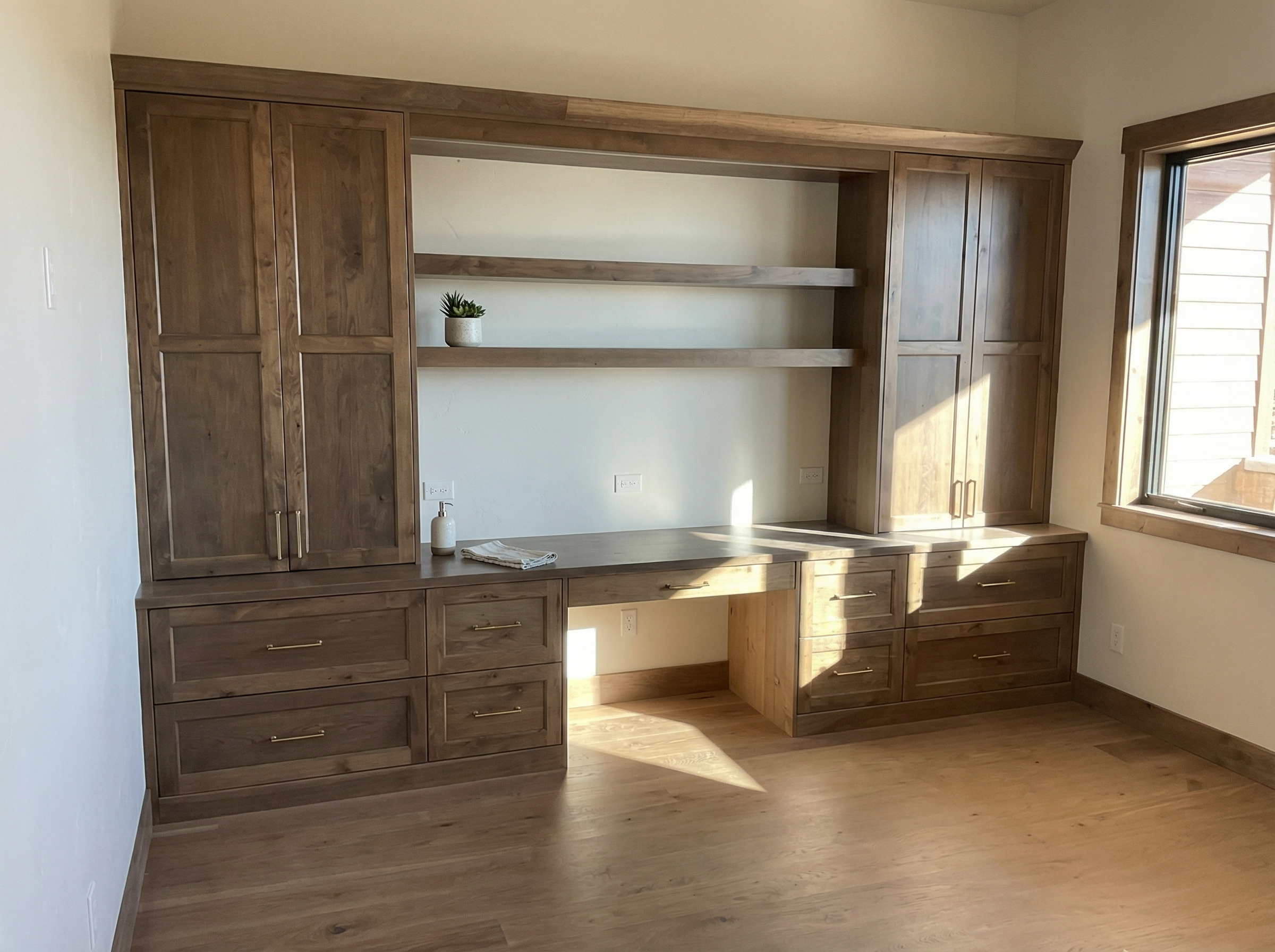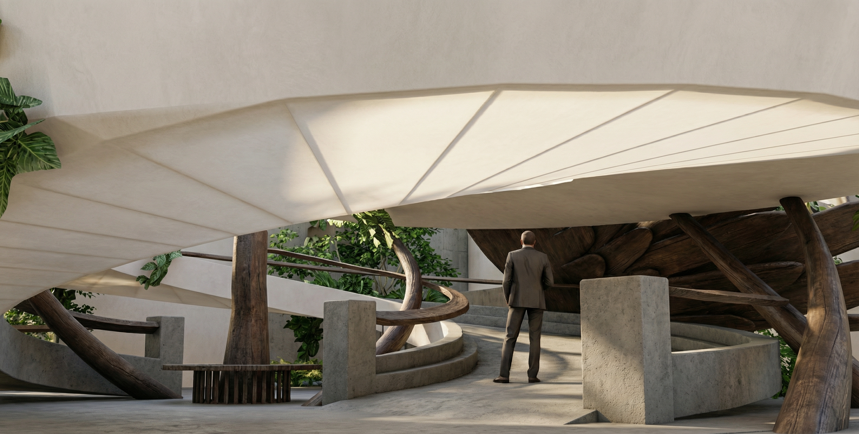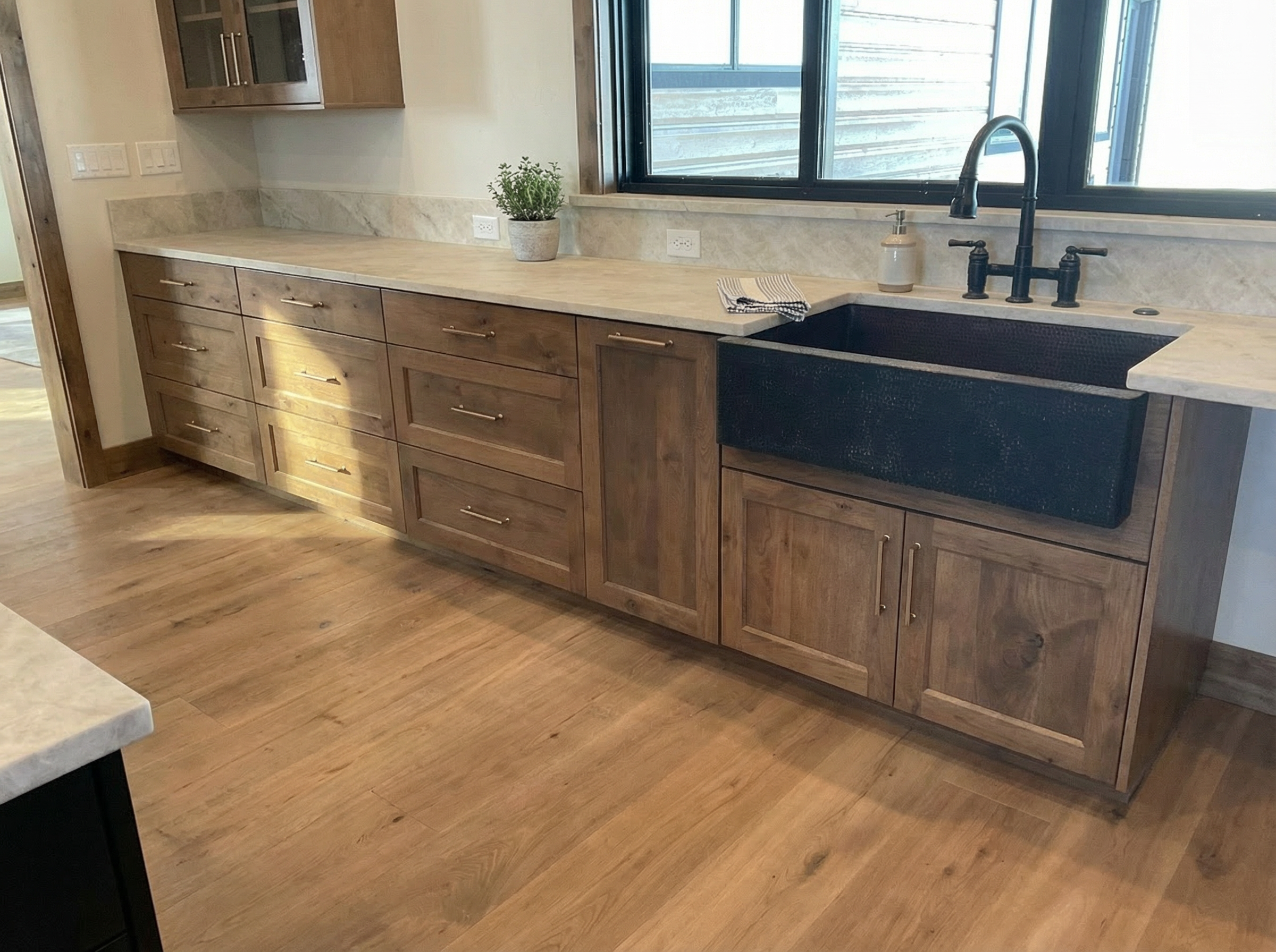 render an ultra modern kitchen interior with high ceilings include sleek white walls and cabinets contrasted by a pristine white quartzite countertop with soft veining the hood is a dark cold rolled steel add warmth with a deep espresso colored dining table and island cabinets and upholstered chairs in a soft beige accented by golden legs illuminate the space with soft ambient lighting for a cozy yet sophisticated atmosphere on the far left you see a bar with charcoal cabinets white onyx counters that are backlit and a metallic textured backsplash with glass shelves lit from above to shine on the bottles the counters by the windows should be a white quartzite with soft veining maintain a spacious airy feel with large windows