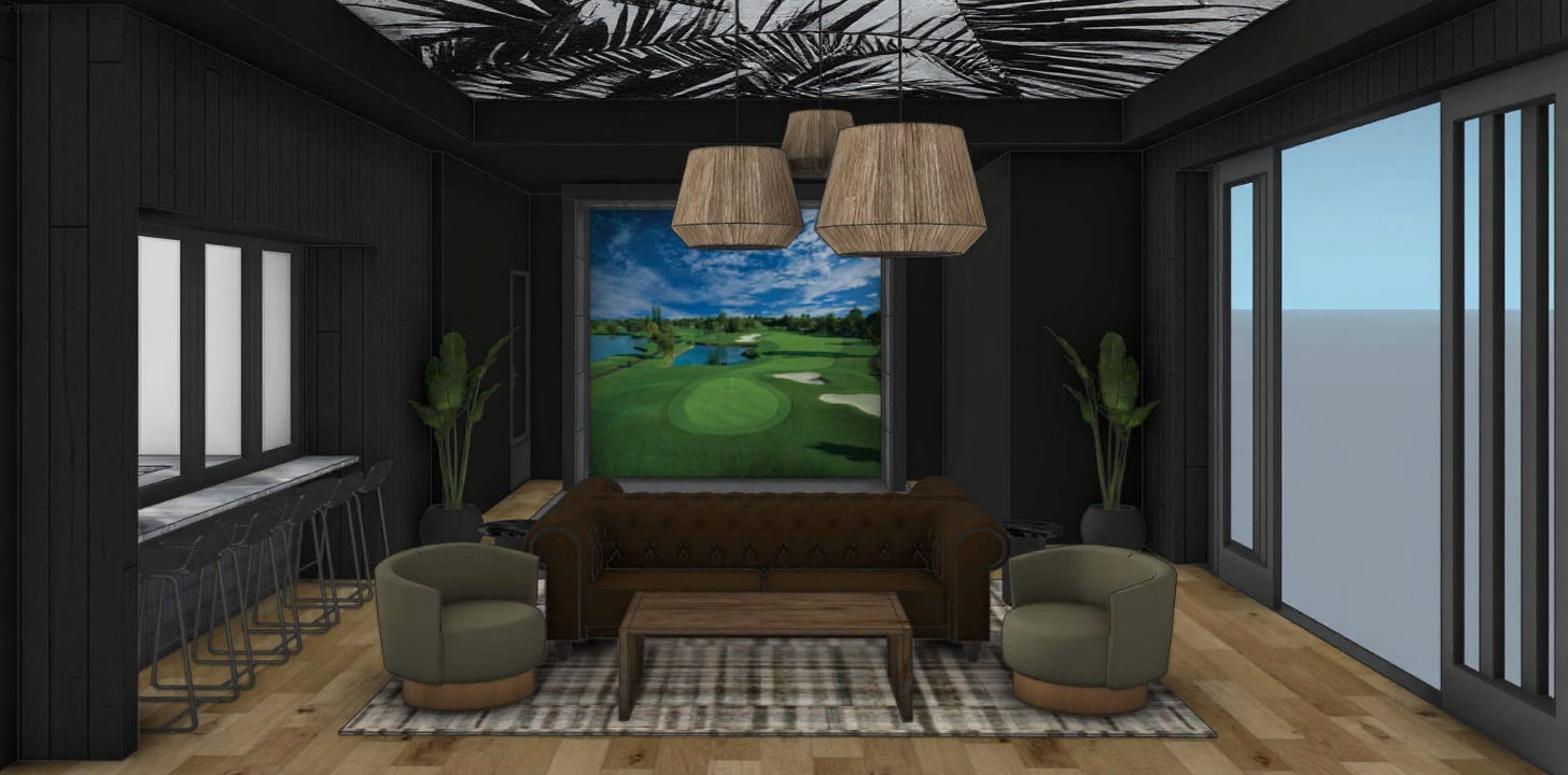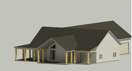 create a beautiful rendering of a modern house with a spacious design use white for the exterior walls giving the home a clean and contemporary look the roof should be a dark charcoal gray adding a sleek contrast highlight the wooden pillars and beams with a natural light oak color set the house in a serene environment with a clear blue sky lush green grass and gentle sunlight casting soft shadows ensure the atmosphere feels warm and inviting