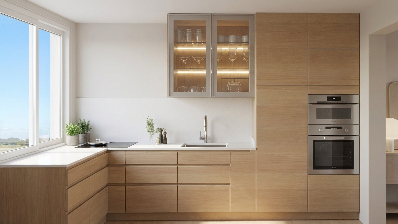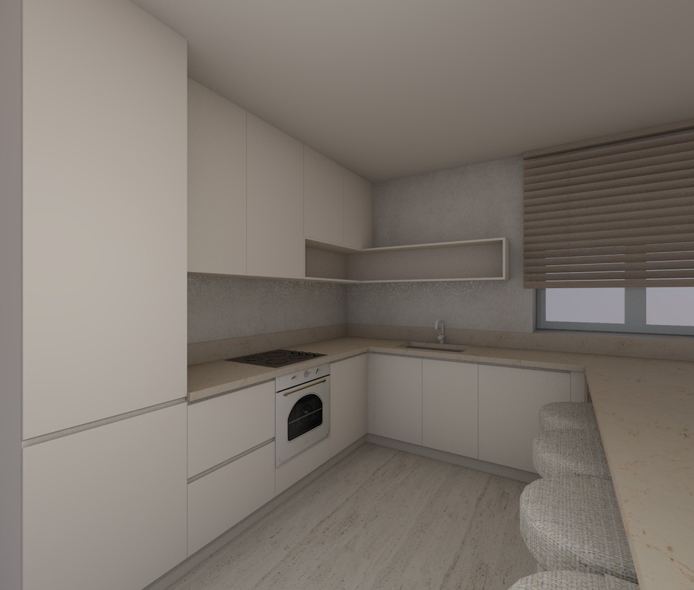 create a highly realistic render of a modern kitchen in a coastal home with a calm warm and refined atmosphere the design is minimal and cohesive inspired by seaside living with a soft neutral palette that evokes natural light sand tones and a relaxed elegance the kitchen layout is linear with an l shaped extension featuring clean handle less cabinetry in a light beige tone with a matte finish the surfaces appear smooth and seamless the countertop and backsplash are in a natural light beige stone reminiscent of sand and coastal textures with subtle variations and a soft matte finish a hidden led strip is installed beneath the upper cabinets providing soft indirect lighting that gently illuminates the backsplash and enhances the warm ambient atmosphere at the back a window allows soft natural light to enter the space filtered through a light fabric vertical blind wood on the window reinforcing the relaxed seaside feeling the walls are finished in light beige microcement and the flooring is in a light natural tone enhancing the airy and serene coastal atmosphere the overall lighting is soft and diffused combining natural light with hidden led lighting creating minimal shadows and a warm inviting high end coastal ambiance ultra realistic render high resolution premium materials coastal interior design interior design magazine photography style off white