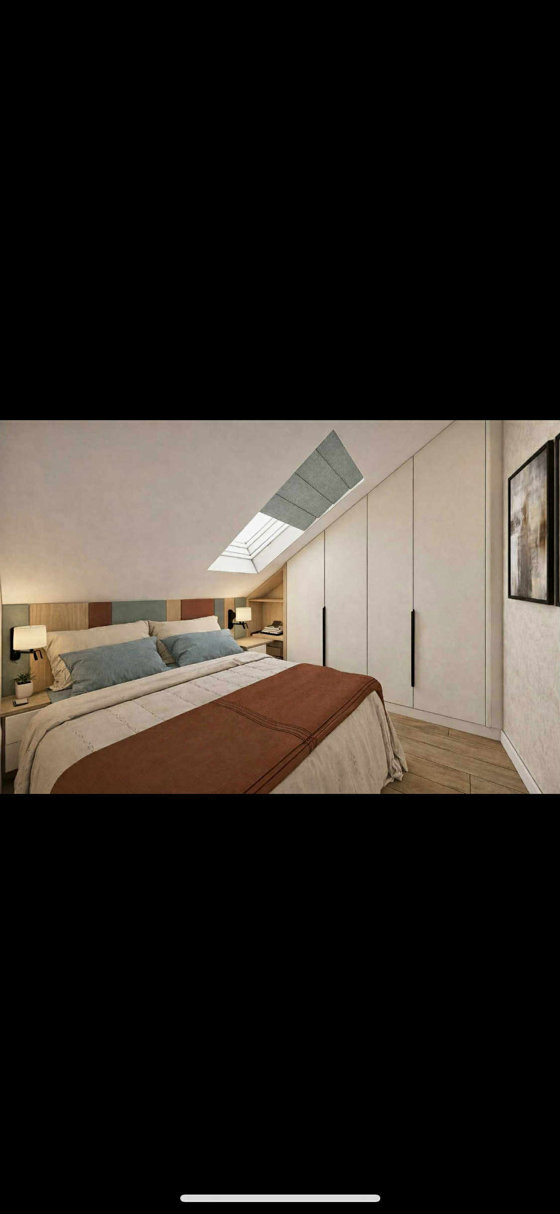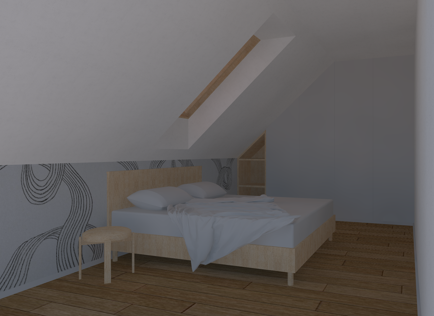 exterior shot add light add some things to the shelves add bedside lamp without light do something with the bedding but dont changre the window shape or any shape make the whole picture brighter the wood is light oak the floor is loight oak as well add a big natural rug add one row of spots to the roof daytime picture