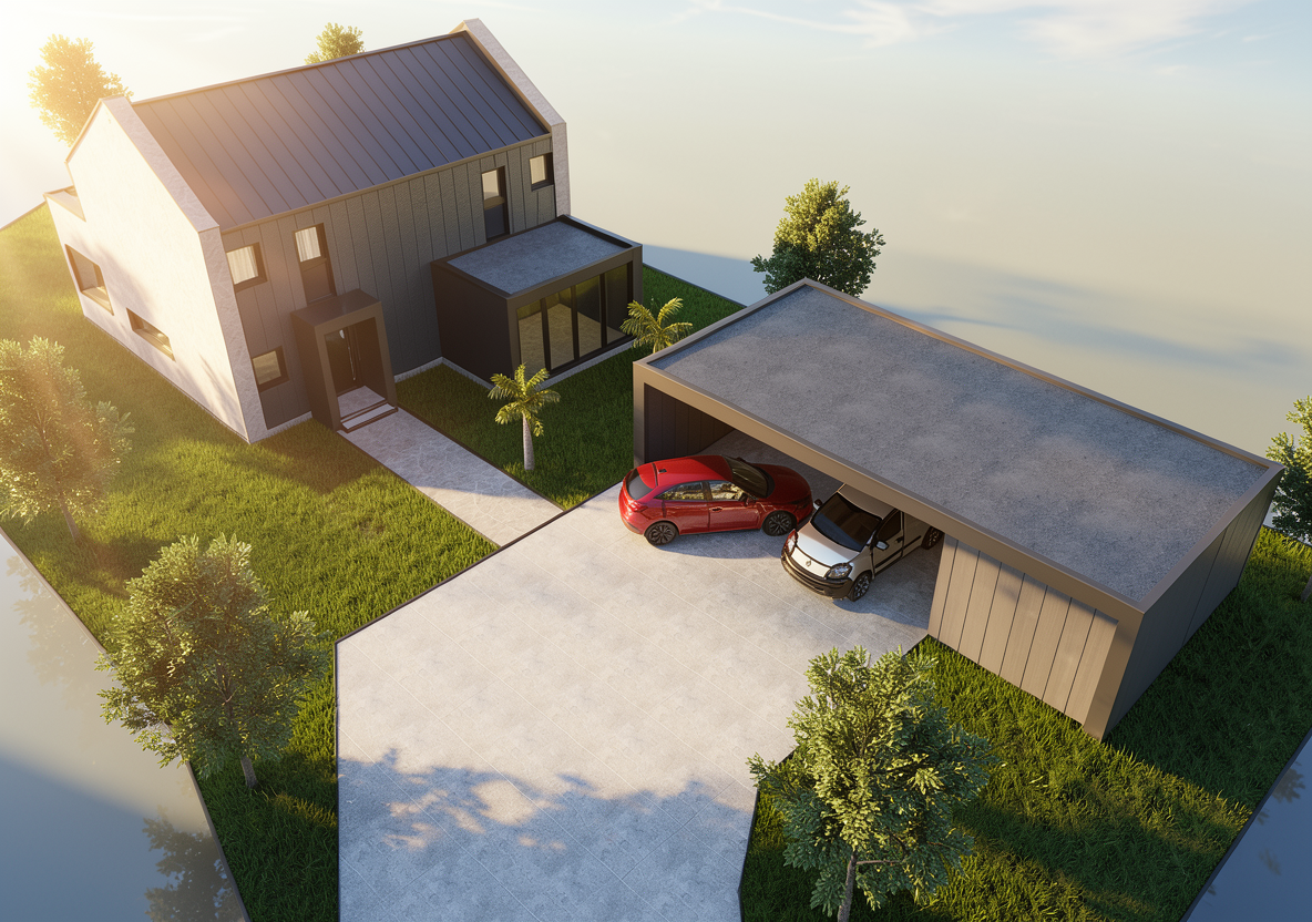 you are a professional image renderer you create the highest grade renderings around and specialize in architectural renderings this is the floor plan of a house create a marketing floor plan that showcases this home design keep the windows as they are where they are keep the doors as they are where they are keep the main structure as it is where it is feel free to change the perspective do not add anything to the structure or furnishings that i have not asked for the surrounding site will be a luxury estate make a paver driveway from the porte cochere to the garage the bathroom in the lower left corner is a laundry room add a pool to the backyard
