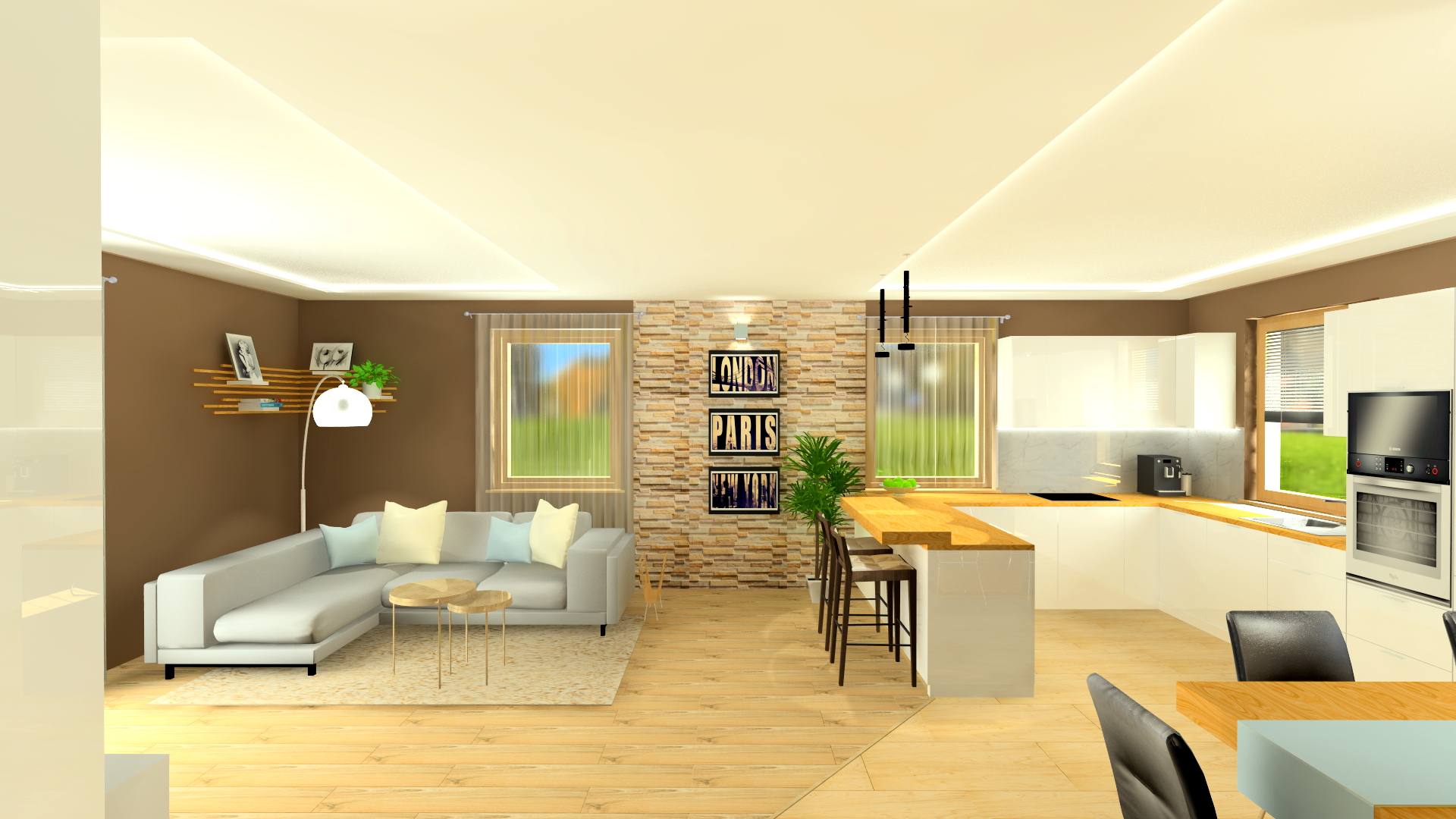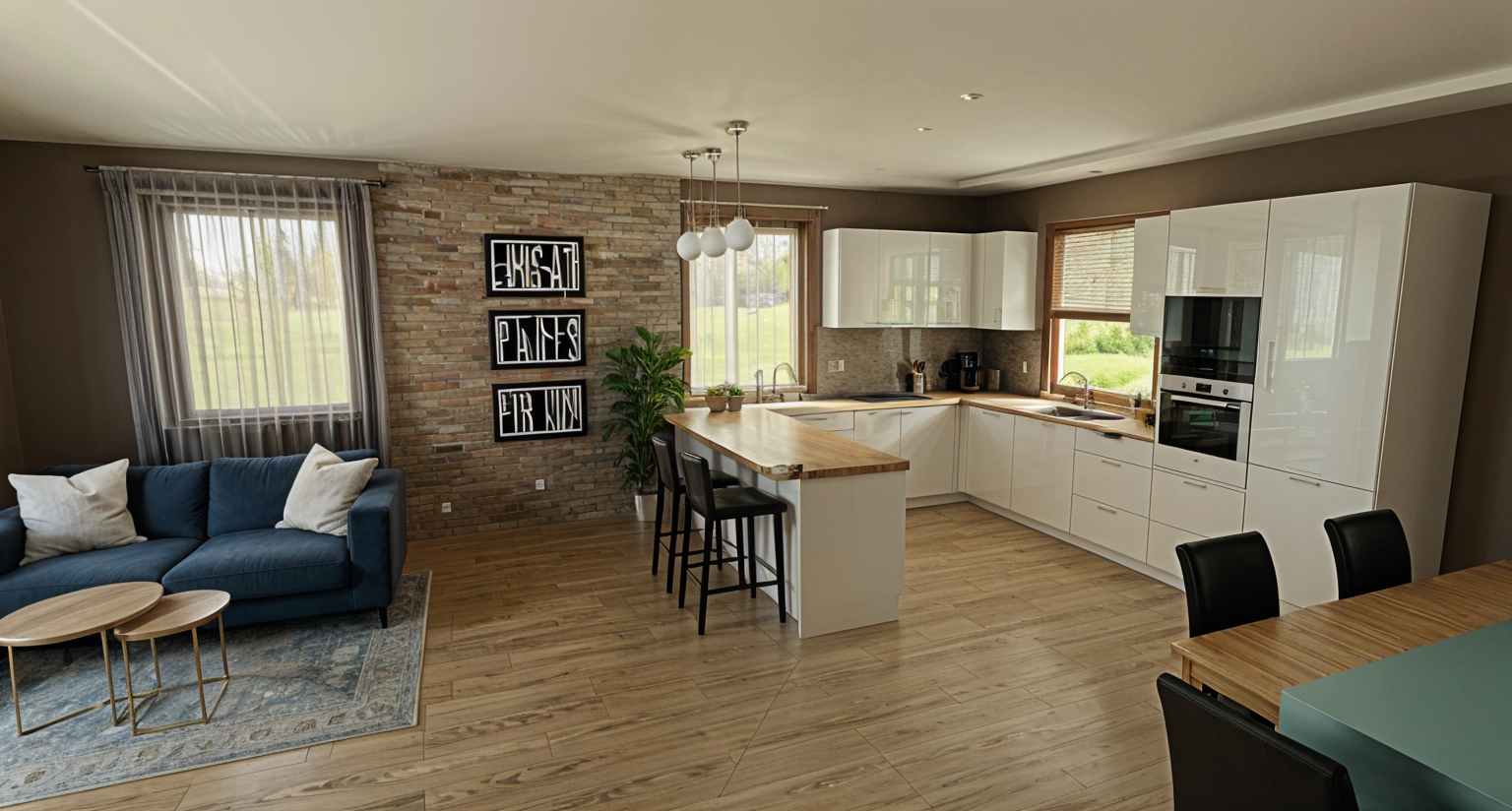 light grey sofa with white and light blue pillows and pictures on the wall and led lights