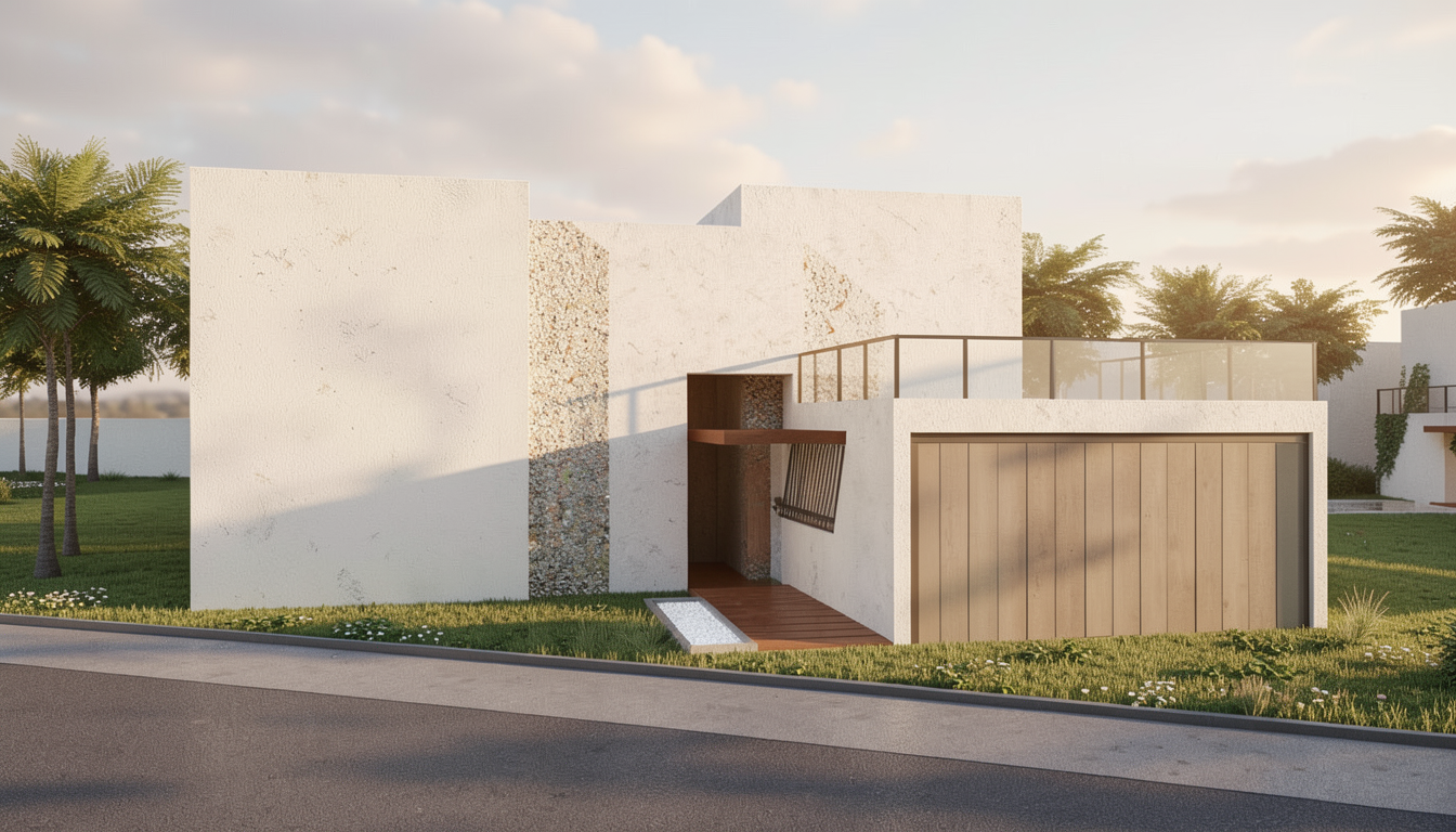 add details like vegetation outdoor furniture a car entering the garage through the pathway and people add also windows and shaders to the facade of the building make it look more realistic