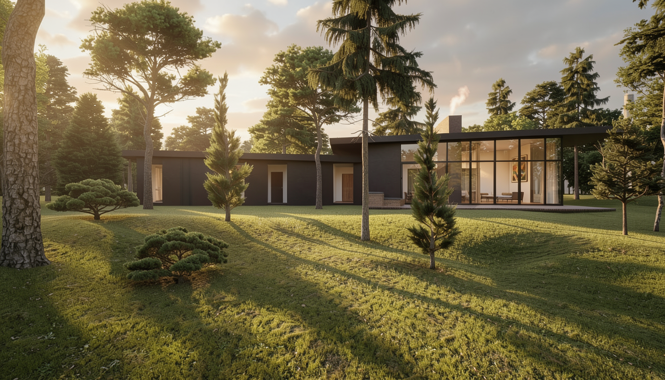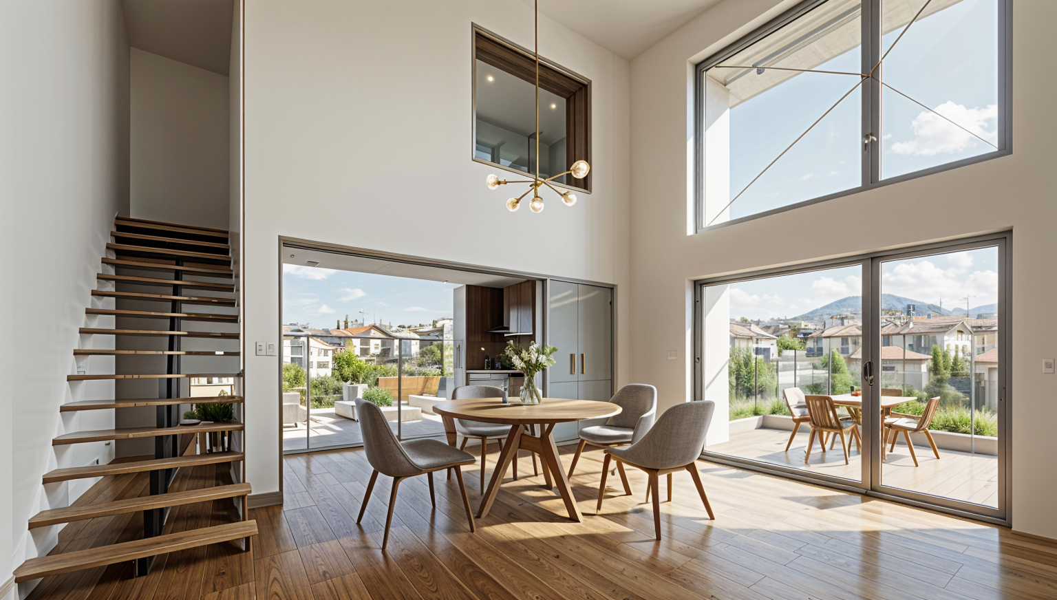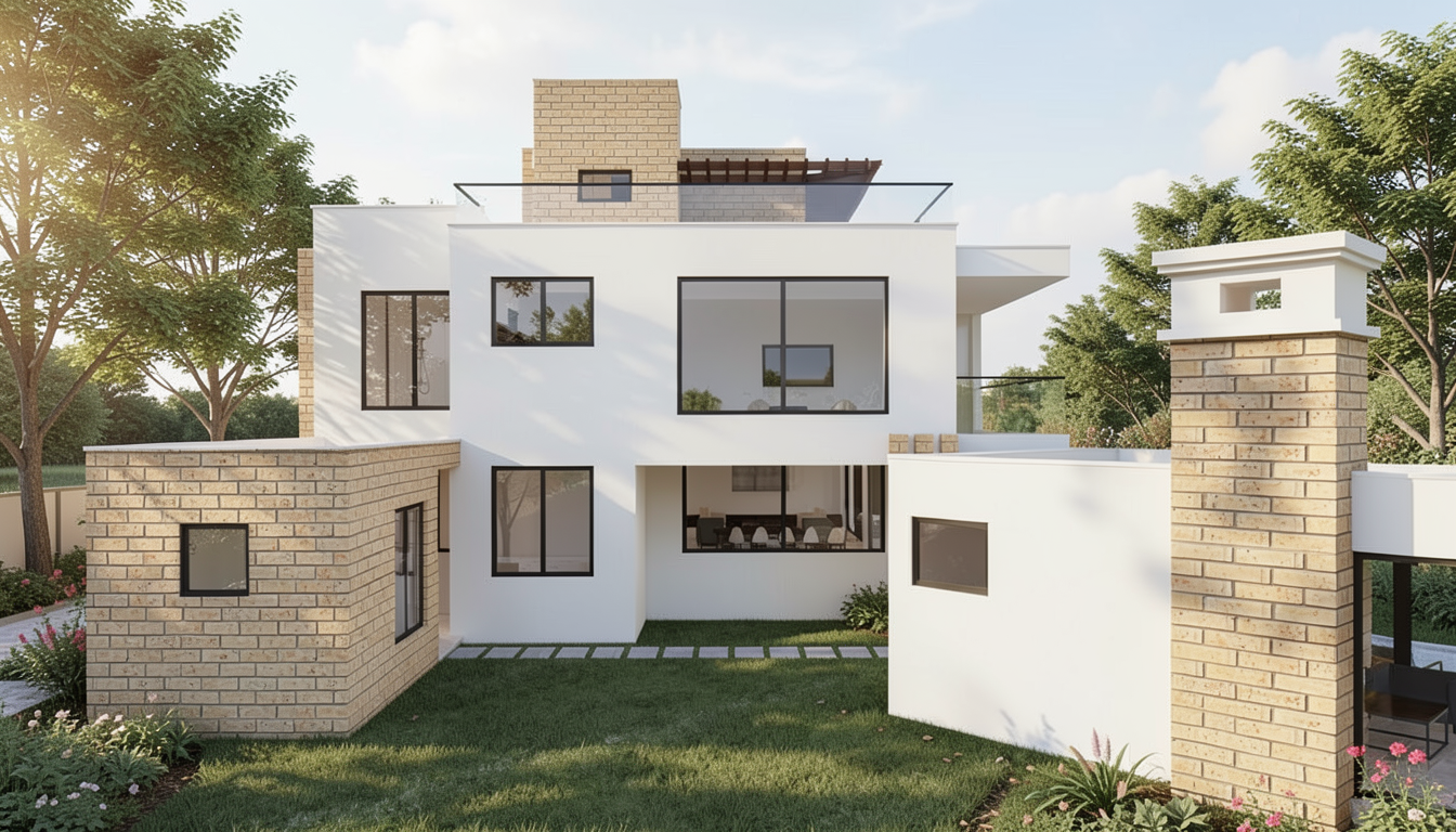 enhance the cgi render with photorealistic lighting improved material definition and refined textures correct and upgrade the entrance door material to high quality natural wood with realistic grain accurate scale subtle imperfections and proper reflectance improve global illumination soft natural shadows realistic reflections and overall sharpness while preserving the original architecture proportions and design intent no change to geometry or layout