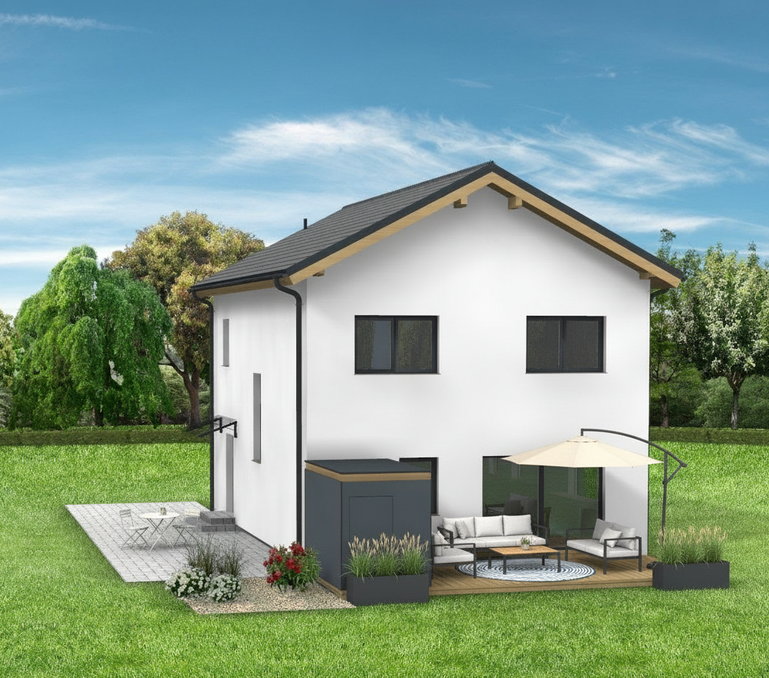 modern lounge and entertainment space interior render neutral elegant palette with greige limewash walls light wood flooring and a central large light gray sofa facing a wall mounted tv sleek black structure and glass shelving for the bar the dark black visible pieces on the bar area should be black tinted wood the background wall of the shelving is smoked mirror with warm backlighting bar stools and a round dining table with upholstered recycled leather chairs soft ceiling lighting refined contemporary atmosphere realistic materials subtle reflections and a clean photorealistic architectural visualization style
