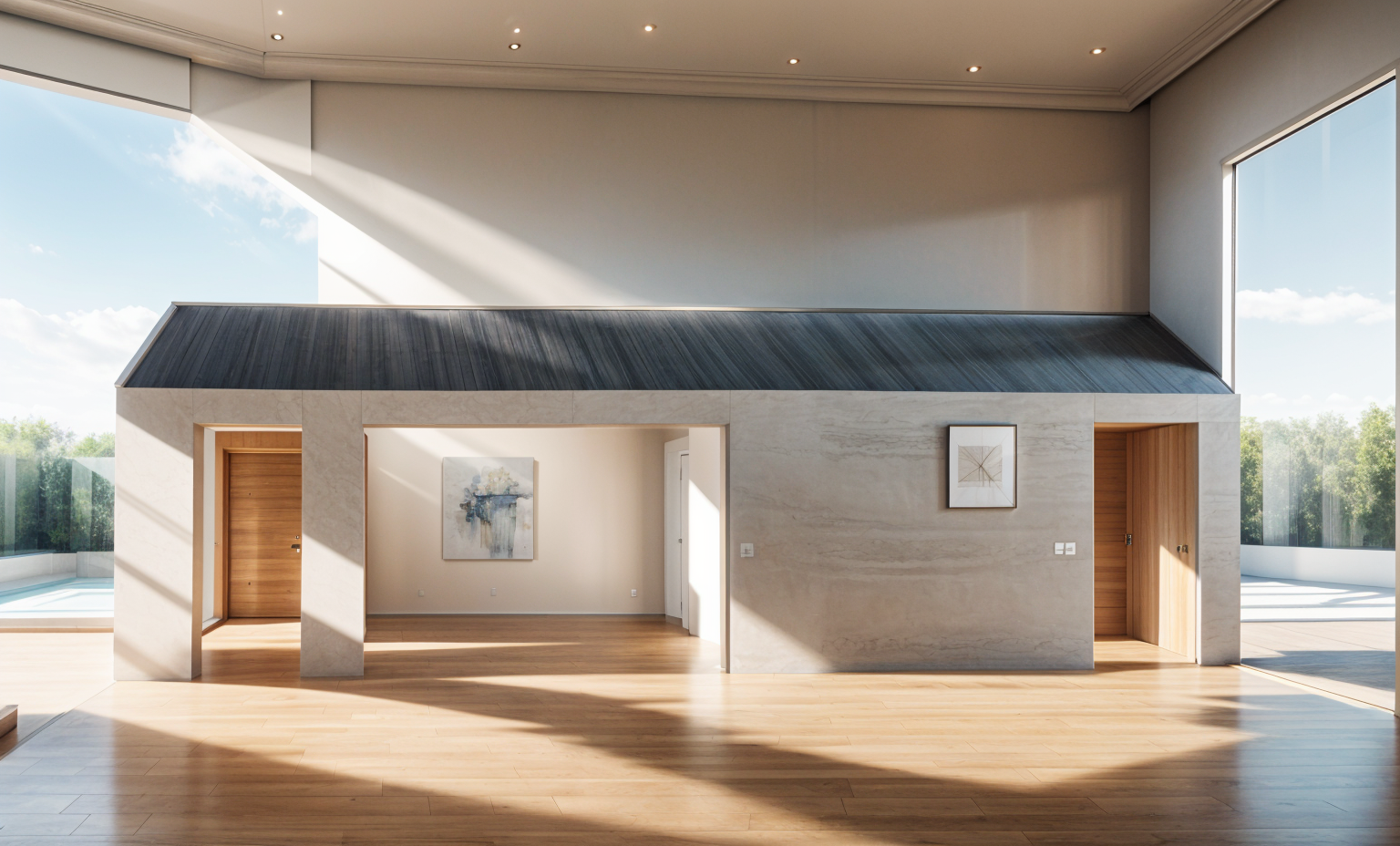 sunny morning day in the kitchen all cabinets in white matt surface countertop in black stone led above the sink lightspots on the top for more brightness the floor in beige white tiles like a stone led strip above the sink more light in the front of the kitchen the oak surfaces in oak bright