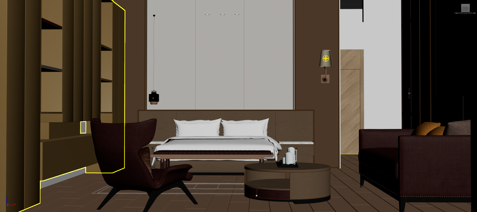 create a detailed and realistic 3d render of a modern bedroom with sleek warm tones the room should feature a comfortable bed with pillows a contemporary armchair and a stylish round coffee table the design should highlight the use of neutral brown colors with wooden textures showcasing well lit spaces and soft lighting for a cozy inviting atmosphere include shelves with books ambient lighting on the walls and an elegant door frame avoid including any bright saturated colors such as neon or vivid hues the focus should remain on neutral tones